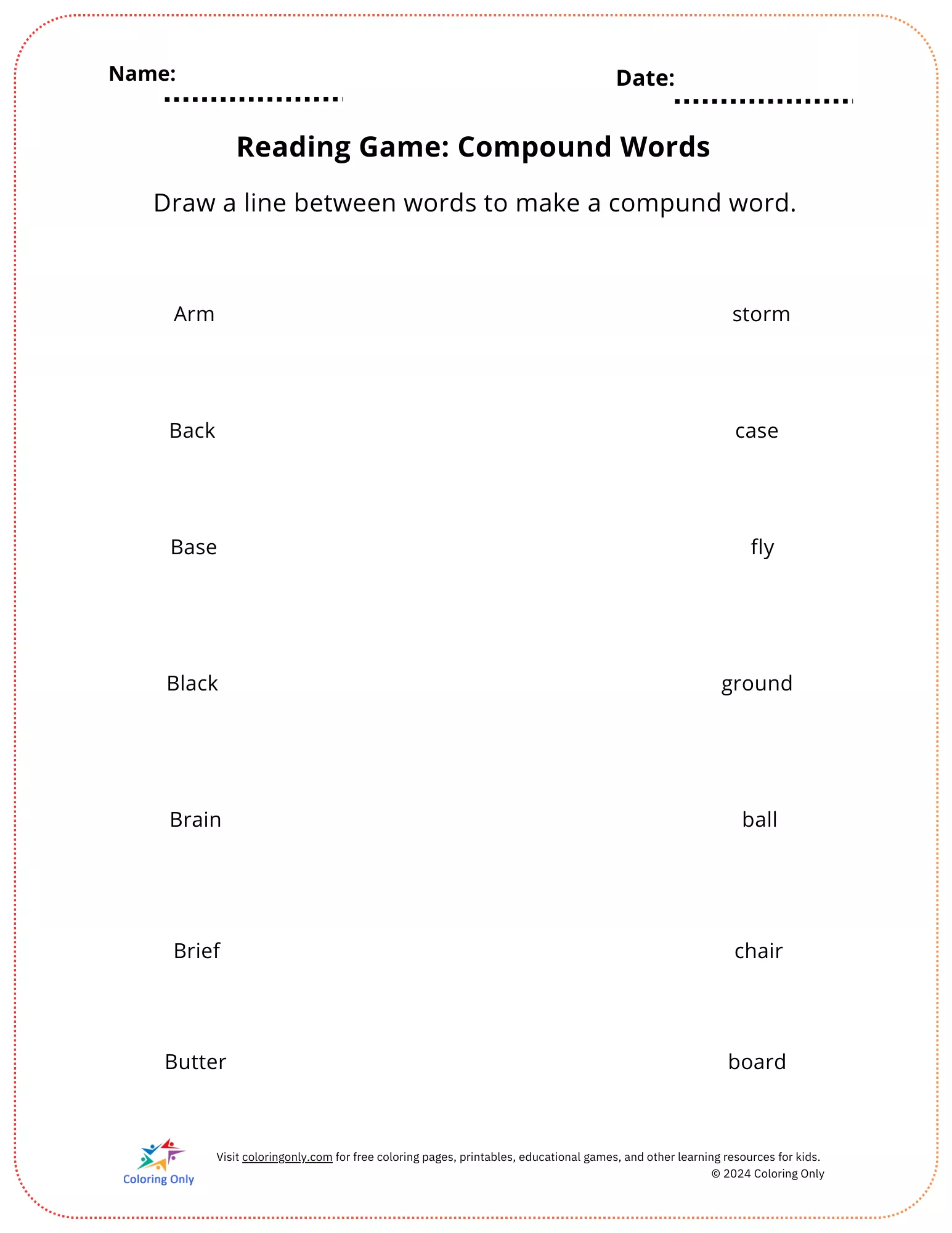 Engage your elementary students with this Reading Game: Compound Words Free Printable Worksheet! This fun and interactive activity allows kids to connect words to form compound words, enhancing their vocabulary and reading skills. With word pairs like "butter" and "board" or "black" and "ground," students can enjoy learning while boosting their language comprehension. This Reading Game: Compound Words Free Printable Worksheet is perfect for classroom activities, homework, or homeschooling, providing a simple and effective way to teach compound words in an enjoyable format.