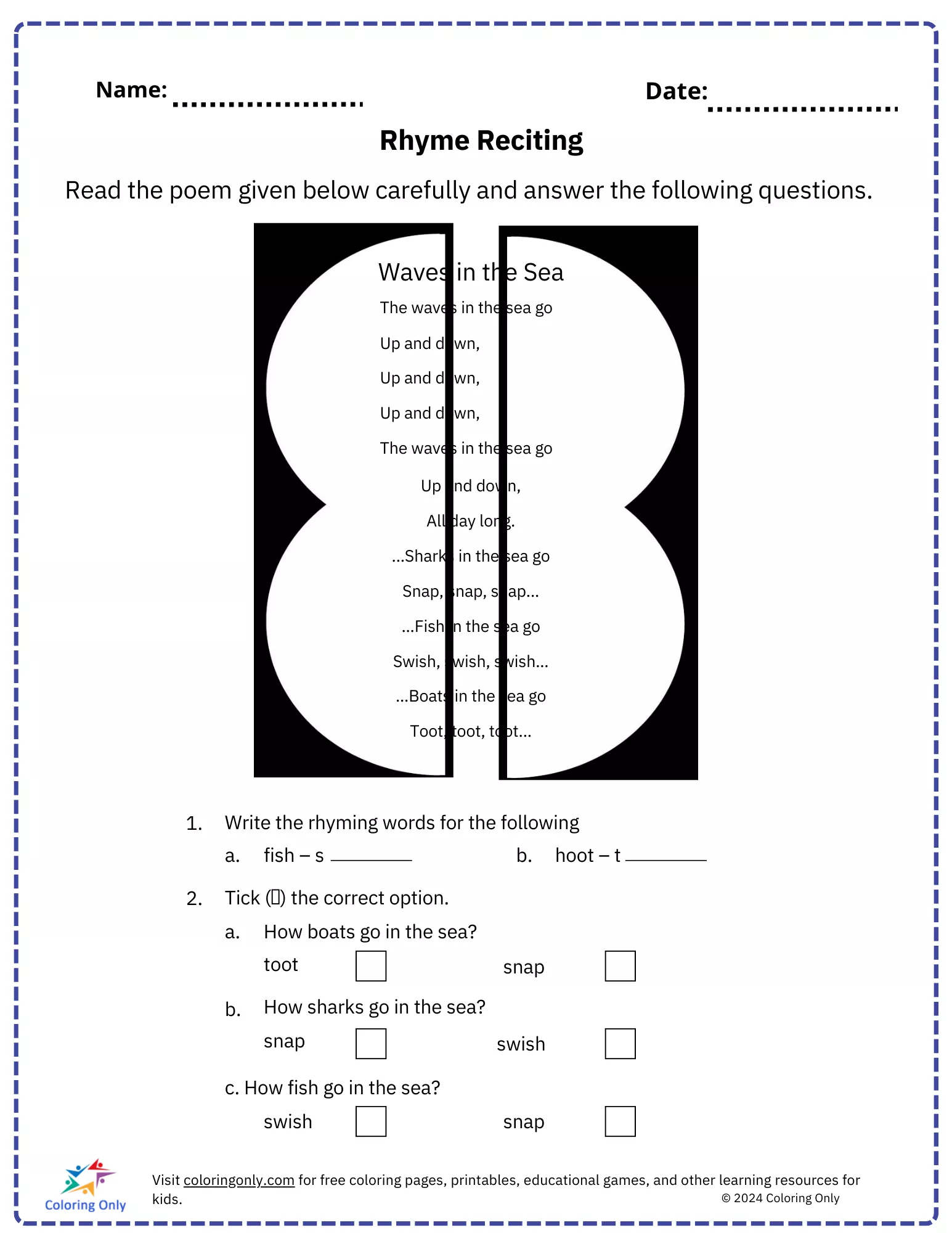 This Rhyme Reciting Free Printable Worksheet engages elementary students in learning rhyming words and reading comprehension through a fun and interactive poem about the sea. The worksheet includes exercises that ask students to identify rhyming pairs and answer questions about how different sea creatures move. This Rhyme Reciting Free Printable Worksheet enhances reading fluency while strengthening the ability to recognize patterns in language, making it a valuable addition to any early learning curriculum.