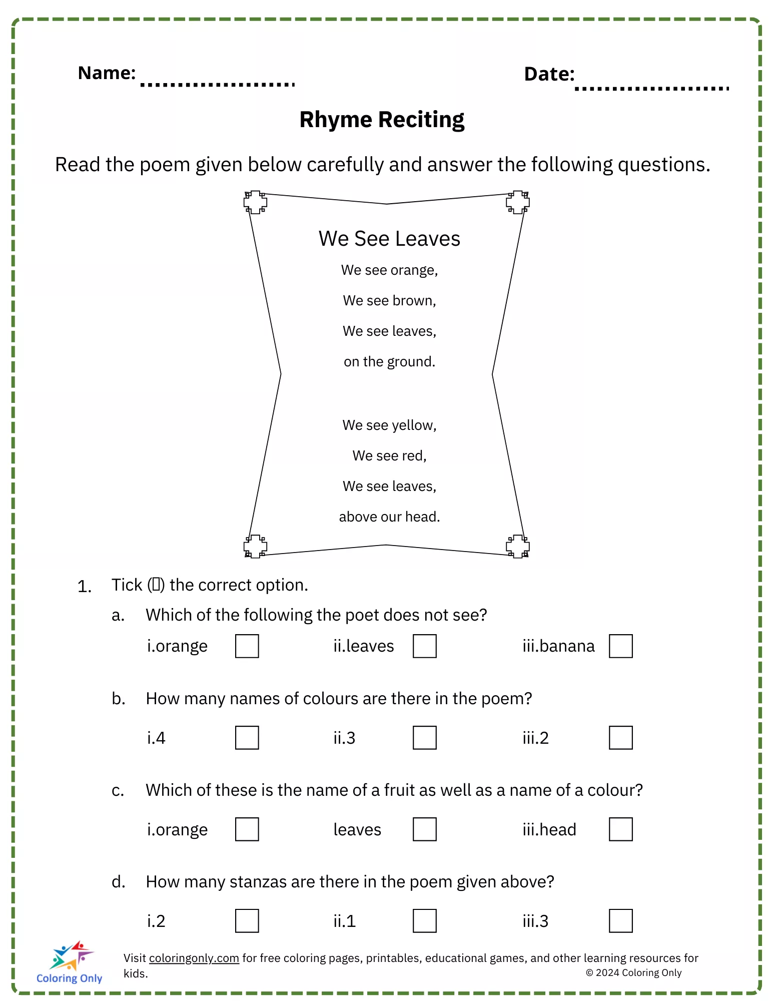 The Rhyme Reciting Free Printable Worksheet is an excellent activity for elementary students to practice reading comprehension and poetry analysis. In this worksheet, students are asked to read the poem "We See Leaves" carefully and answer multiple-choice questions about the poem’s content. The activity reinforces their ability to identify rhyming words, recognize colors, and understand stanza structures. This Rhyme Reciting Free Printable Worksheet helps children develop critical thinking while enhancing their poetry appreciation.
