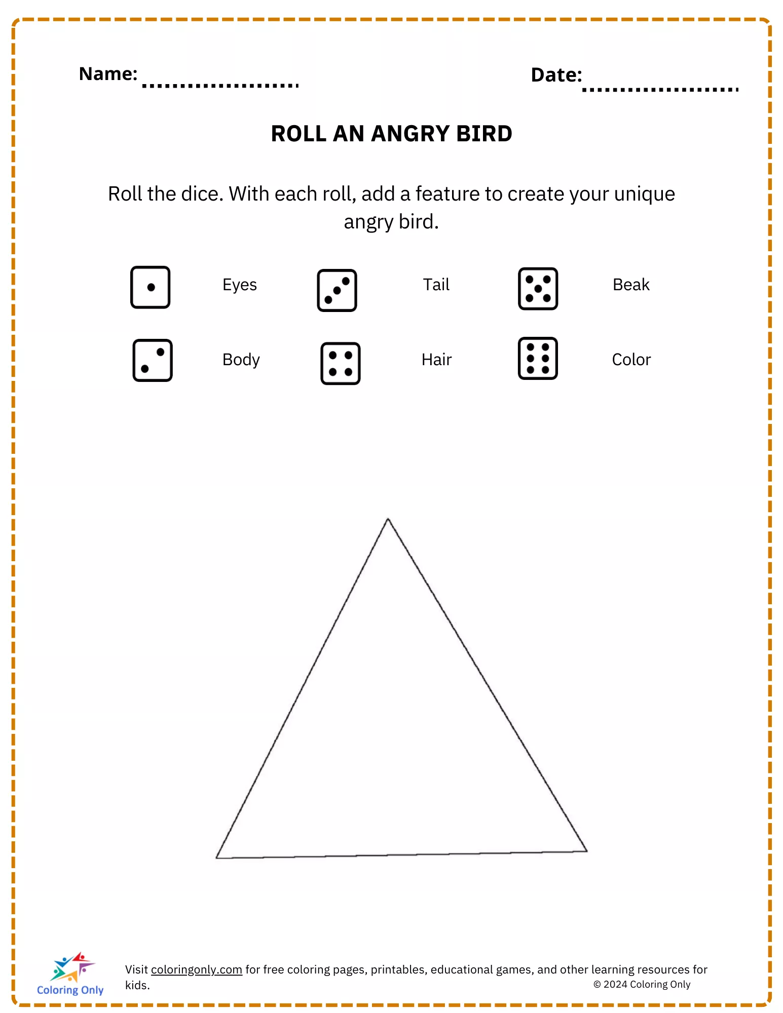 The ROLL AN ANGRY BIRD Free Printable Worksheet is a fun and interactive activity designed for elementary students. In this creative game, students roll a dice and, based on the number rolled, they add specific features to their angry bird, such as eyes, tail, body, and color. This unique activity encourages creativity, imagination, and problem-solving skills as kids get to design their own custom angry bird. Download the ROLL AN ANGRY BIRD Free Printable Worksheet to engage your students in a playful way to explore drawing and design.