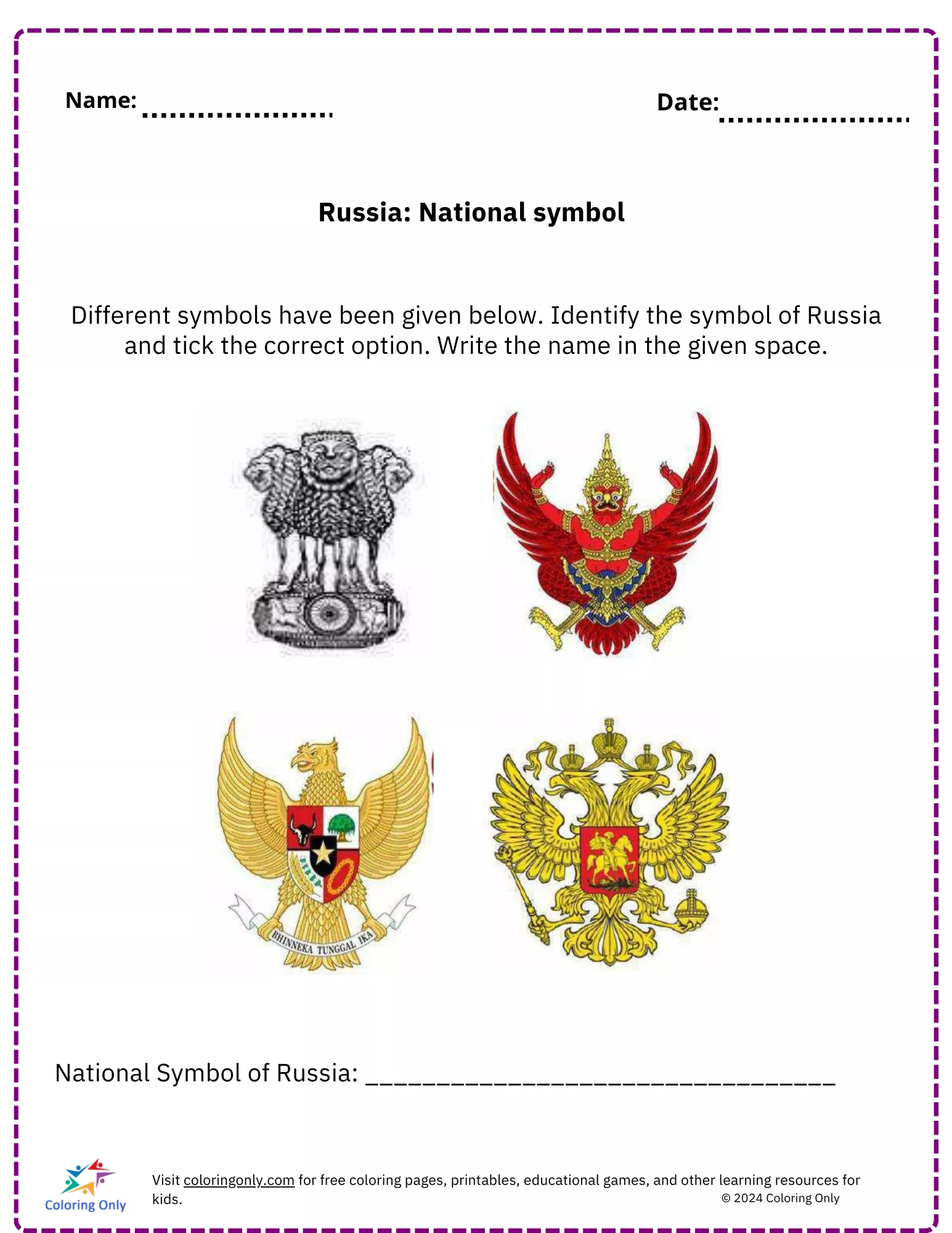 The "Russia: National symbol free Printable Worksheet" is a fun and informative resource for elementary students to learn about Russia's national emblem. This worksheet provides images of different national symbols from various countries, and students are tasked with identifying Russia's symbol. They will tick the correct option and write the name of Russia's national symbol in the provided space. This "Russia: National symbol free Printable Worksheet" encourages children to explore world symbols, enhances their understanding of national identity, and supports global awareness in an engaging and educational way.