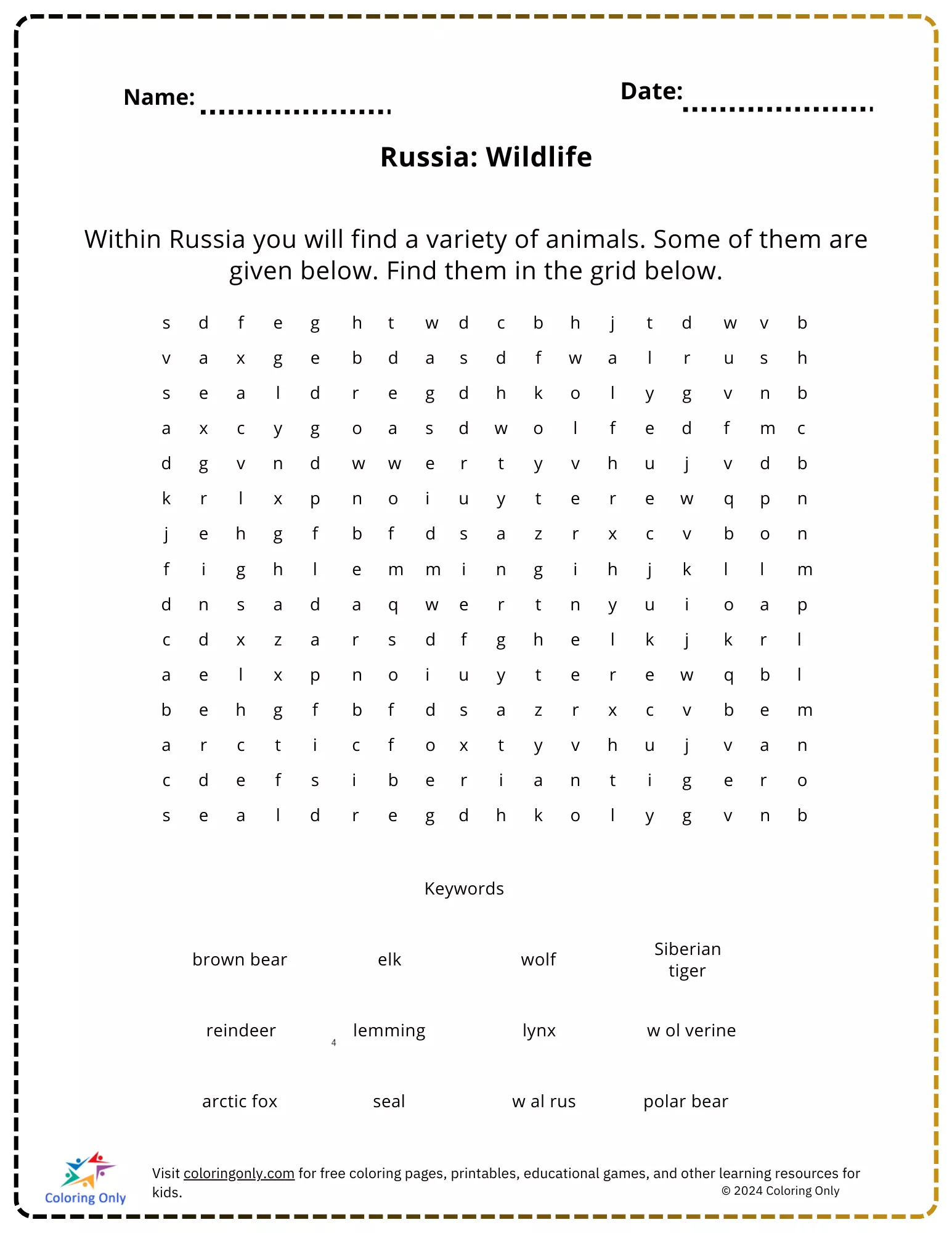 The "Russia: Wildlife Free Printable Worksheet" is an engaging activity designed for elementary students to explore the diverse wildlife found in Russia. This word search puzzle features a list of animals native to Russia, such as the brown bear, Siberian tiger, and arctic fox. Students are tasked with finding these animals hidden within the grid, helping them learn and recognize the names of Russian wildlife. This "Russia: Wildlife Free Printable Worksheet" not only enhances vocabulary but also introduces students to the rich biodiversity of Russia in a fun and interactive way.
