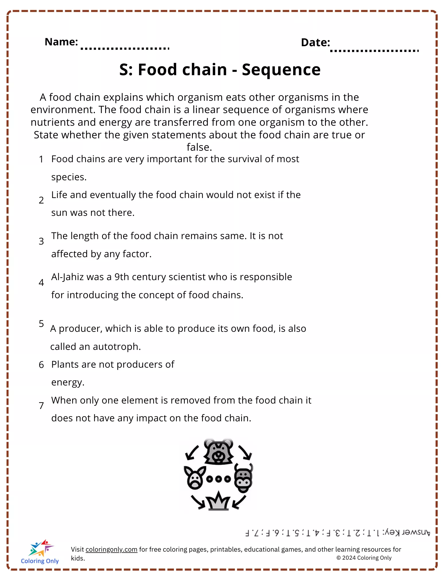The S: Food Chain - Sequence Free Printable Worksheet helps elementary students grasp the concept of food chains and their significance in ecosystems. This worksheet presents a series of true or false statements about food chains, encouraging critical thinking and reinforcing key concepts such as the roles of producers, consumers, and the importance of the sun in sustaining life. With historical references and real-world examples, this S: Food Chain - Sequence Free Printable Worksheet serves as an engaging and educational resource, perfect for enhancing environmental science lessons.