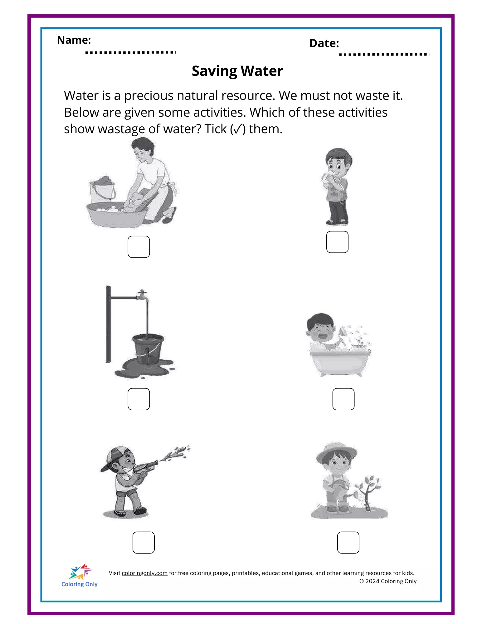 The Saving Water Free Printable Worksheet is an engaging and educational activity designed to teach children the importance of water conservation. Through a series of illustrated activities, students identify actions that waste water and tick (✓) them. This worksheet promotes awareness of sustainable water usage and encourages kids to think critically about their daily habits. The Saving Water Free Printable Worksheet is perfect for elementary classrooms or home learning, fostering environmental responsibility in young learners while making the learning process fun and interactive.