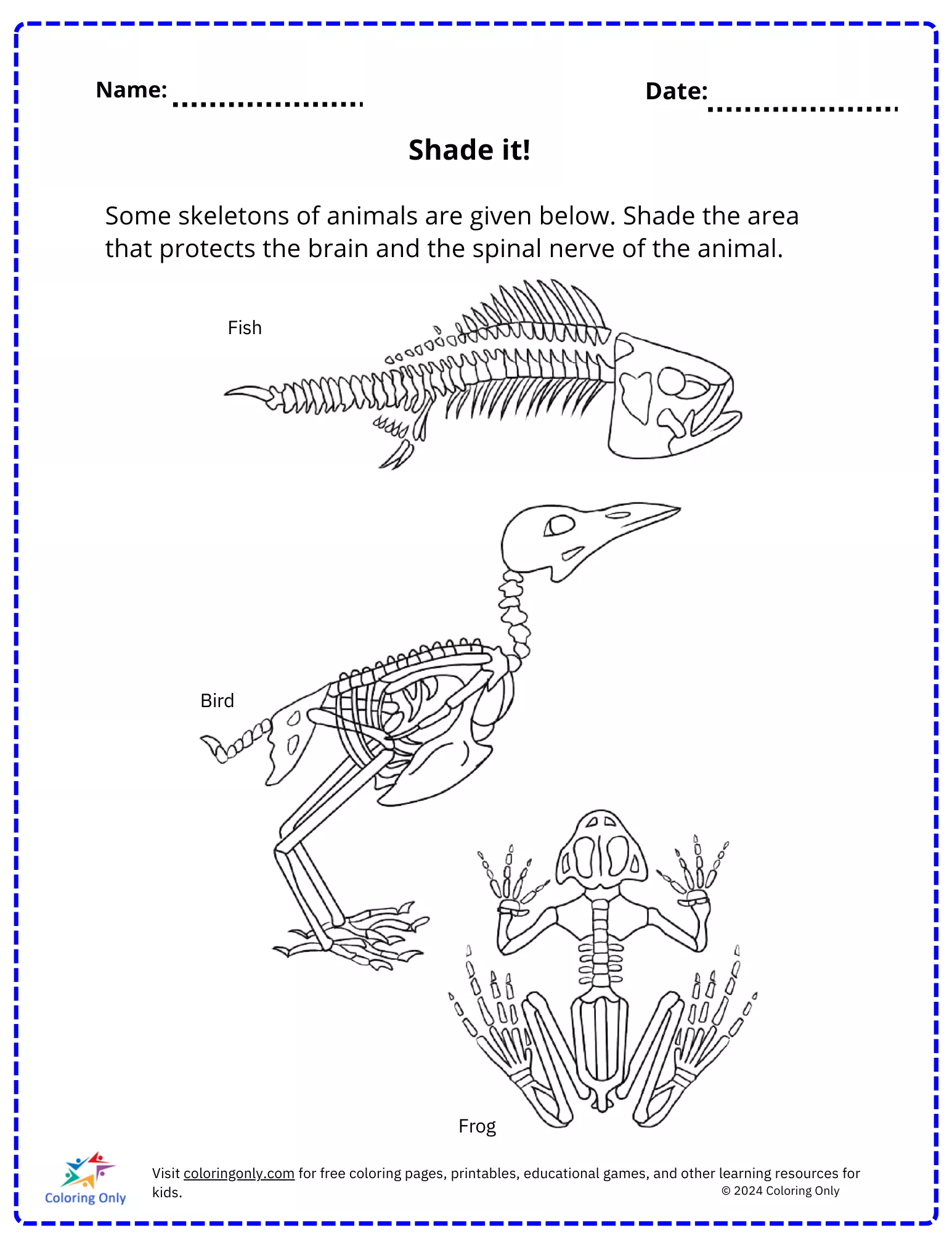 The Shade it Free Printable Worksheet is a fun and educational activity designed for elementary students to learn about animal skeletons. In this worksheet, students are asked to identify and shade the areas of different animals’ skeletons that protect the brain and spinal nerve. Featuring the skeletons of a fish, bird, and frog, this Shade it Free Printable Worksheet helps children engage in visual learning while exploring anatomy in a creative way. Perfect for classroom exercises or science lessons, it combines art with biology, making learning exciting for young learners.