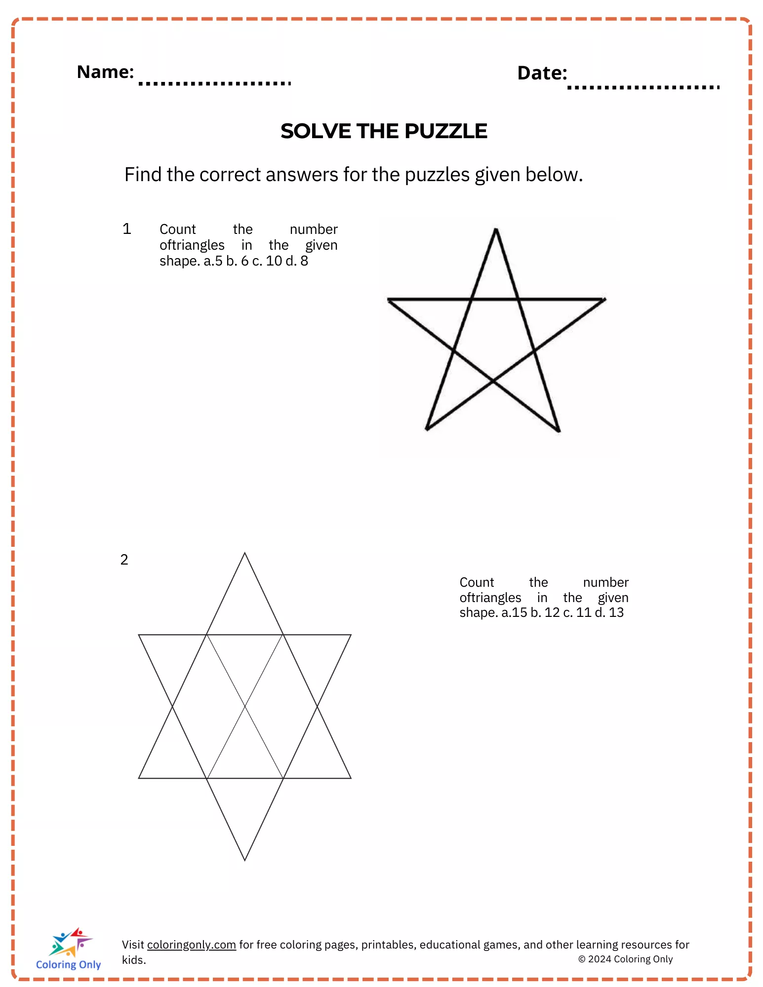 The SOLVE THE PUZZLE Free Printable Worksheet offers a fun and interactive way for elementary students to practice counting and visual recognition. This worksheet focuses on identifying the number of triangles within star shapes. By solving these puzzles, students enhance their spatial reasoning and problem-solving abilities. The exercise is perfect for engaging students in geometry lessons, helping them improve their shape recognition skills and ability to work through visual challenges. With clear instructions and visual puzzles, the SOLVE THE PUZZLE Free Printable Worksheet provides a great balance between fun and learning.