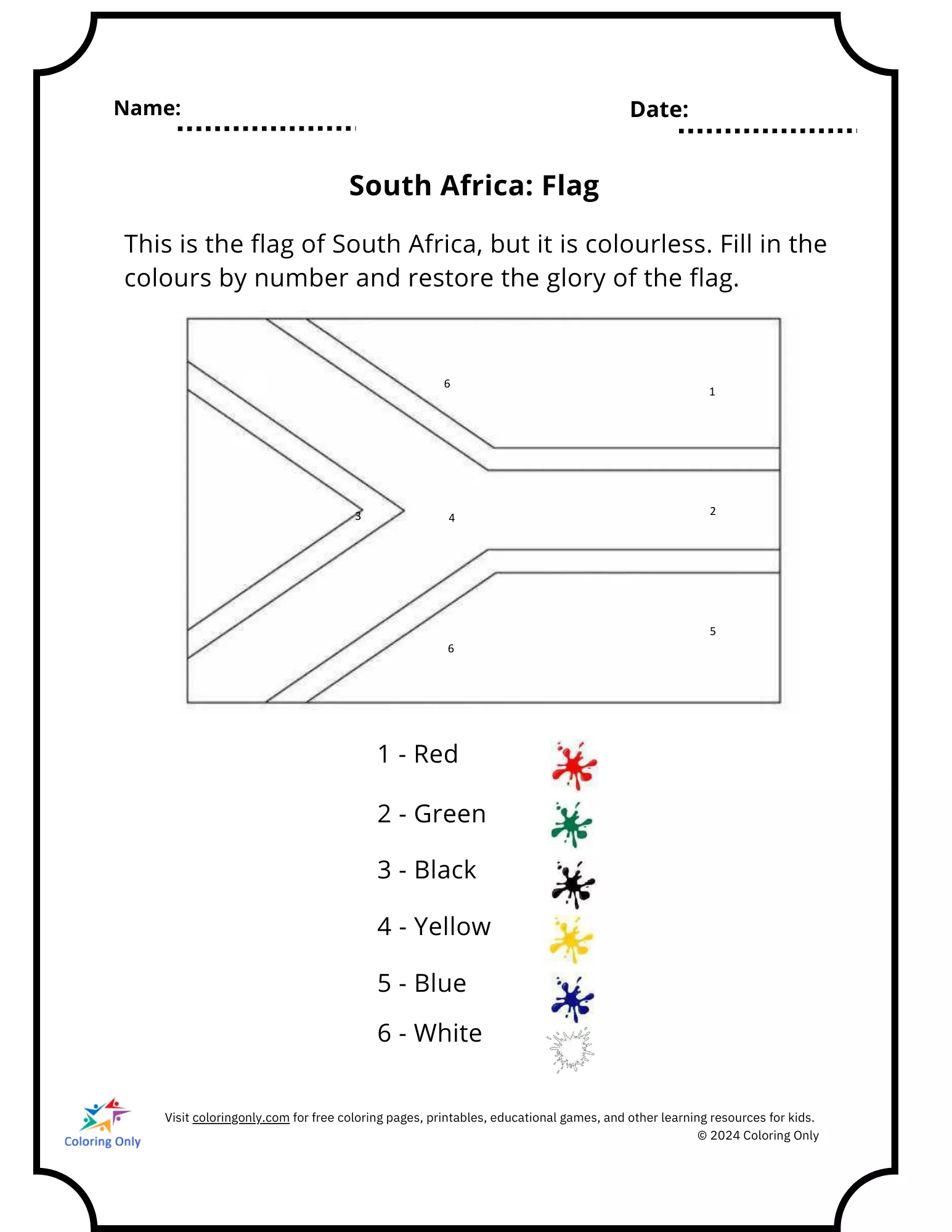 The South Africa: Flag Free Printable Worksheet is a fun and educational activity designed for elementary students to learn about the iconic South African flag. This worksheet allows children to color the flag using the provided color-by-number guide, helping them understand the meaning behind the vibrant colors while developing their artistic and motor skills. The South Africa: Flag Free Printable Worksheet is an excellent resource for introducing topics like geography, culture, and national symbols in an interactive way. Whether used in the classroom or at home, this worksheet provides a hands-on learning experience that combines creativity with education.