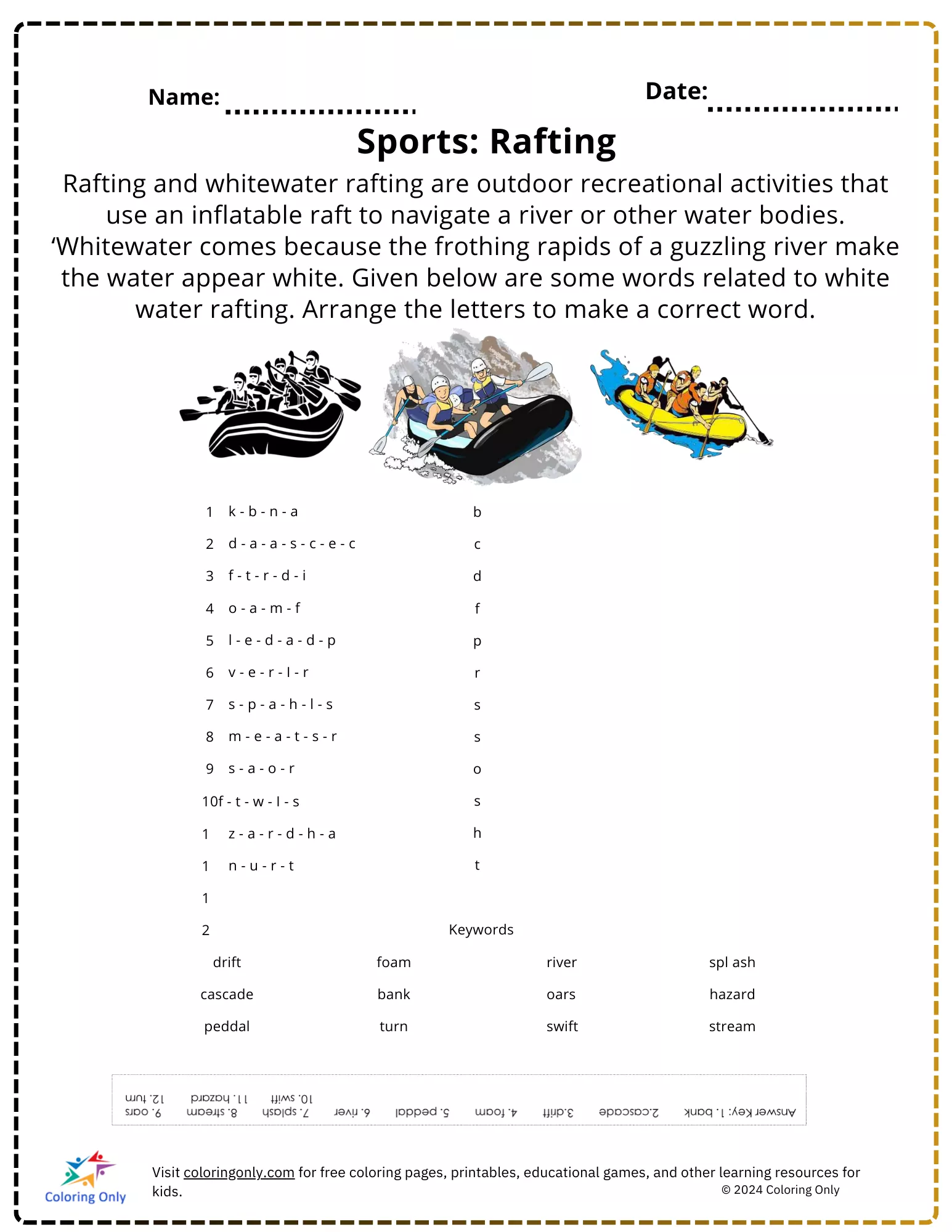 The "Sports: Rafting Free Printable Worksheet" is designed to introduce elementary students to the thrilling activity of rafting. This engaging worksheet encourages students to unscramble words related to white water rafting, helping them become familiar with essential rafting terms such as "river," "oars," and "hazard." It also explains the concept of white water, highlighting the excitement of navigating frothy rapids. Ideal for both classroom and home learning, this activity adds an educational twist to outdoor sports fun. Perfect for kids with an adventurous spirit