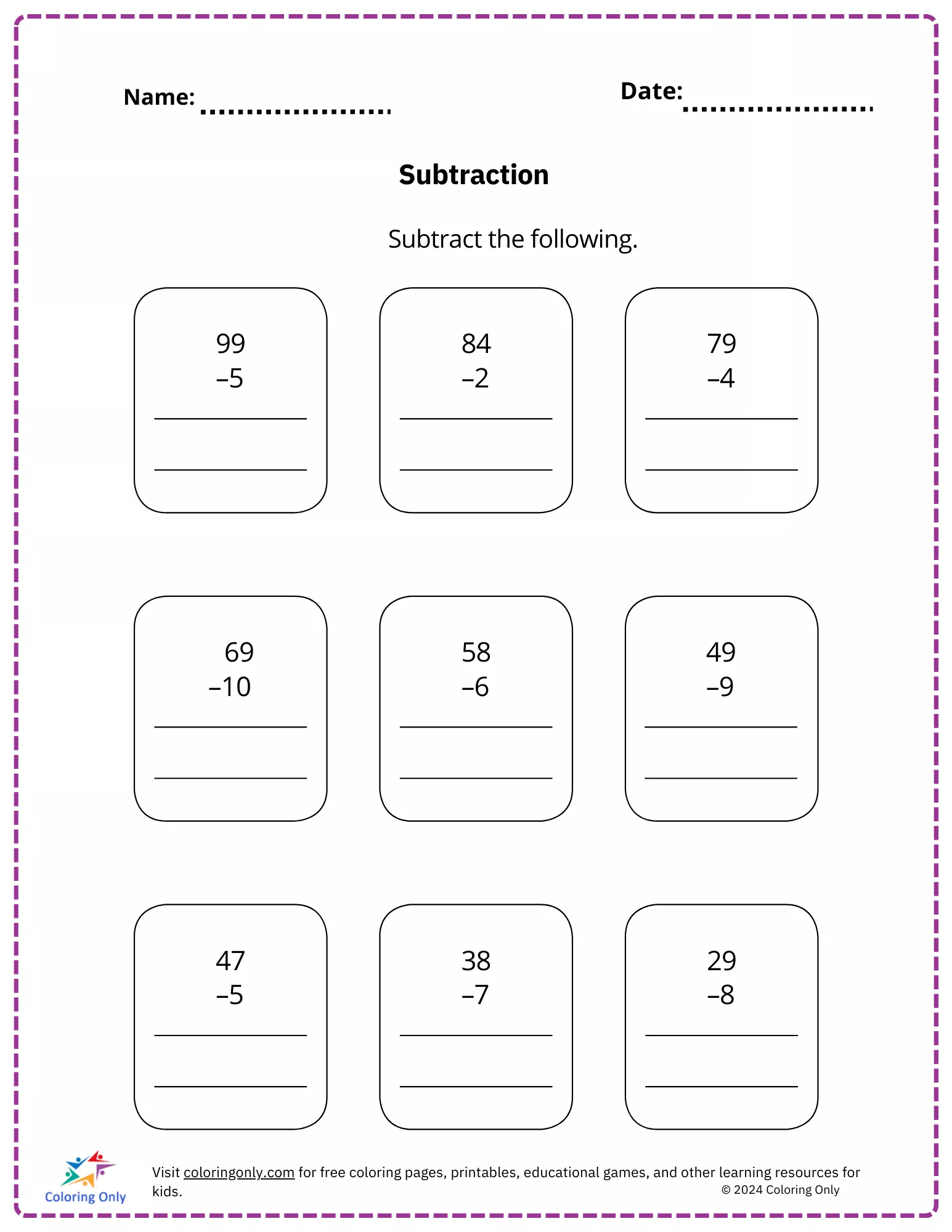 The "Subtraction Free Printable Worksheet" is perfect for elementary students looking to strengthen their subtraction skills. Featuring a range of two-digit subtraction problems, this worksheet helps children practice and develop their mathematical abilities in a simple and structured format. The "Subtraction Free Printable Worksheet" is an excellent resource for both classroom and at-home learning, providing valuable subtraction practice that can help enhance problem-solving skills and math confidence.