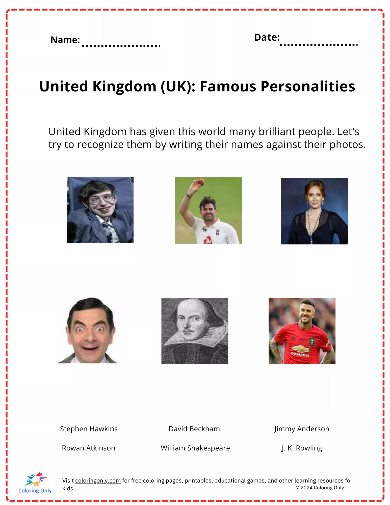 The "United Kingdom (UK): Famous Personalities Free Printable Worksheet" introduces elementary students to some of the most well-known figures from the UK. Students are encouraged to identify and write the names of these famous personalities, including scientists, authors, athletes, and entertainers. This "United Kingdom (UK): Famous Personalities Free Printable Worksheet" is perfect for sparking interest in history, culture, and the achievements of remarkable individuals. It’s a fun and educational way to learn about figures who have significantly contributed to various fields.