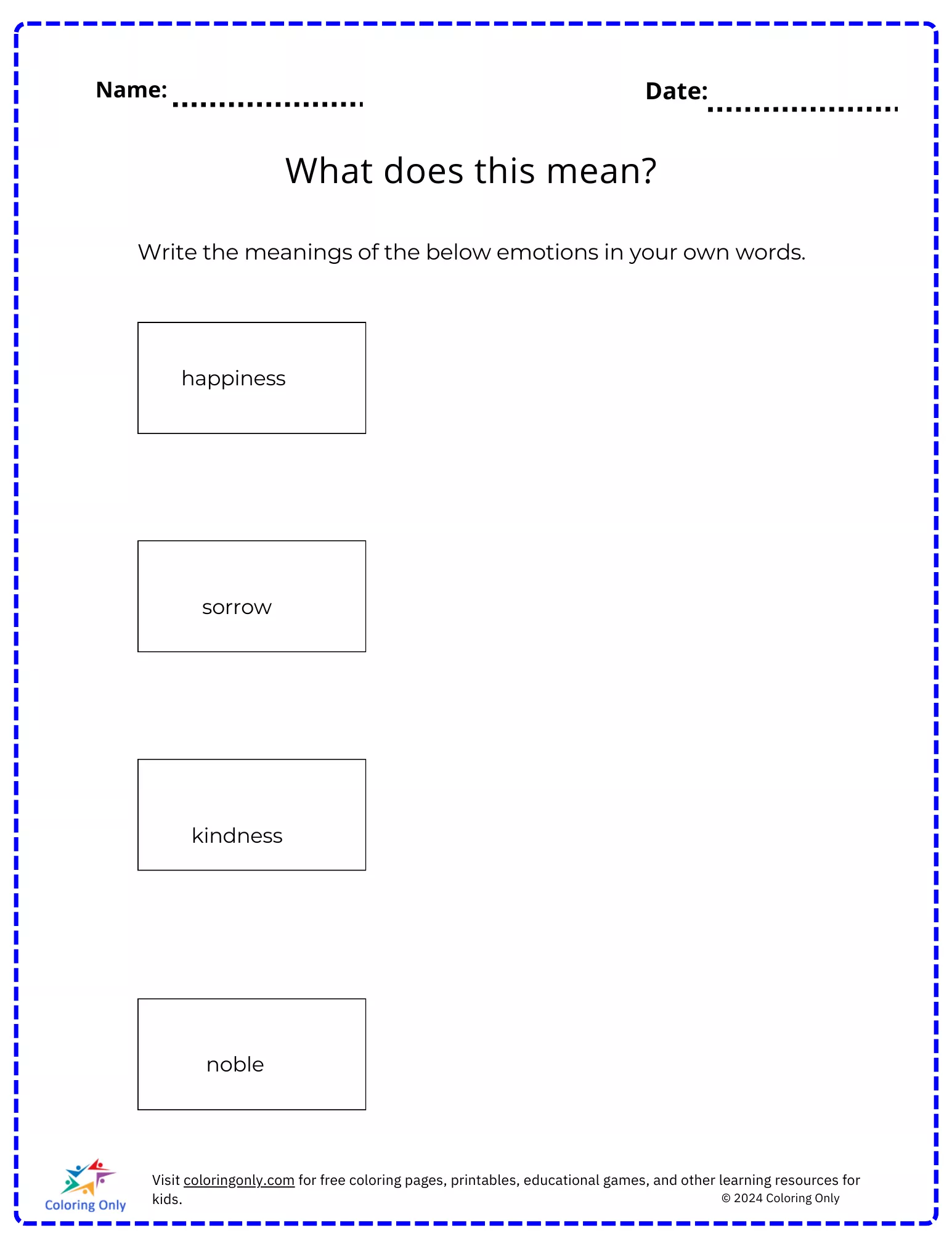 The What Does This Mean Free Printable Worksheet is designed to help elementary students explore and reflect on the meanings of common emotions such as happiness, sorrow, kindness, and nobility. Students are encouraged to write the definitions of these emotions in their own words, allowing for personal expression and deeper understanding of emotional concepts. This worksheet is an excellent tool for building emotional literacy and encouraging critical thinking about feelings. Use this What Does This Mean Free Printable Worksheet to foster discussions about empathy and emotional awareness in a fun and educational way.