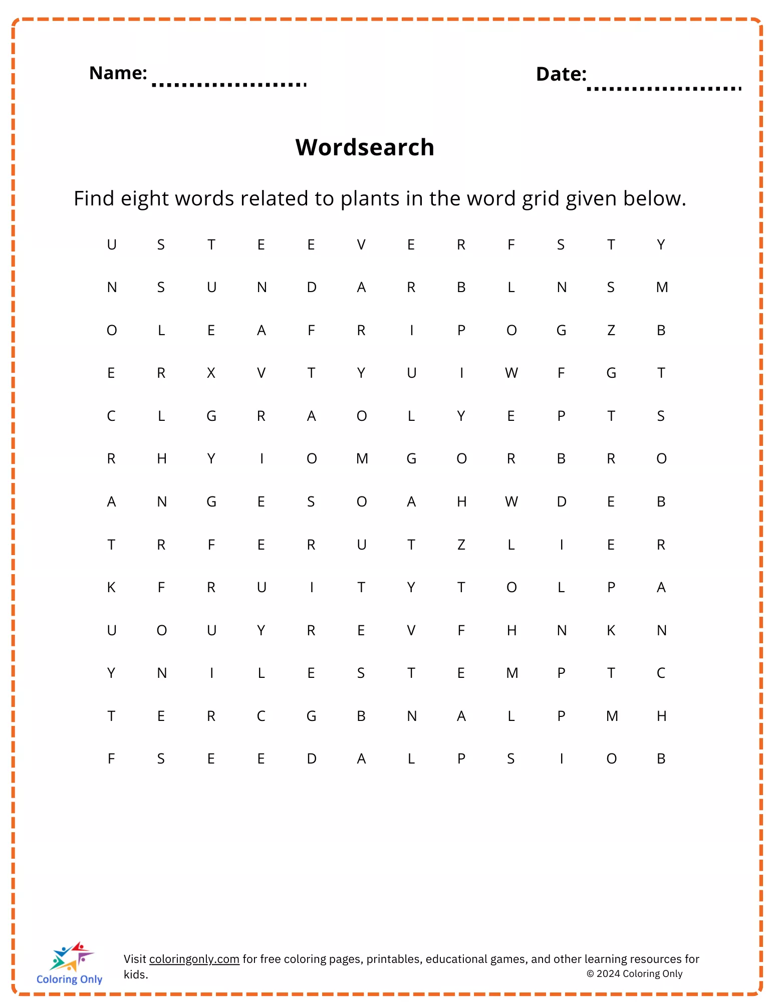This Wordsearch free Printable Worksheet is an engaging and educational tool for young learners. Featuring a grid filled with letters, students are tasked with finding eight words related to plants. As they search for terms like "leaf," "seed," and "fruit," children will strengthen their vocabulary and recognition skills, all while having fun. The Wordsearch free Printable Worksheet is perfect for elementary students and serves as a great classroom activity or homework assignment. It's an ideal way to reinforce lessons about nature in a fun, interactive way.