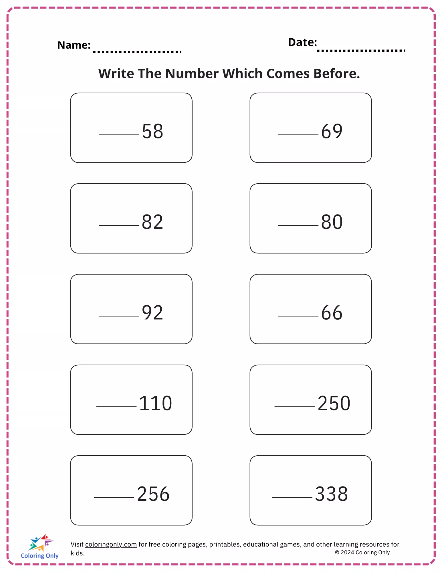The "Write The Number Which Comes Before. Free Printable Worksheet" is a fantastic resource for elementary students to practice their understanding of number sequences. This worksheet prompts students to identify and write the number that immediately precedes a given number, helping them strengthen their numerical order skills. Perfect for use in the classroom or at home, this worksheet supports the development of critical thinking and attention to detail. Whether used for practice or assessment, the "Write The Number Which Comes Before. Free Printable Worksheet" is an excellent tool for reinforcing foundational math concepts.