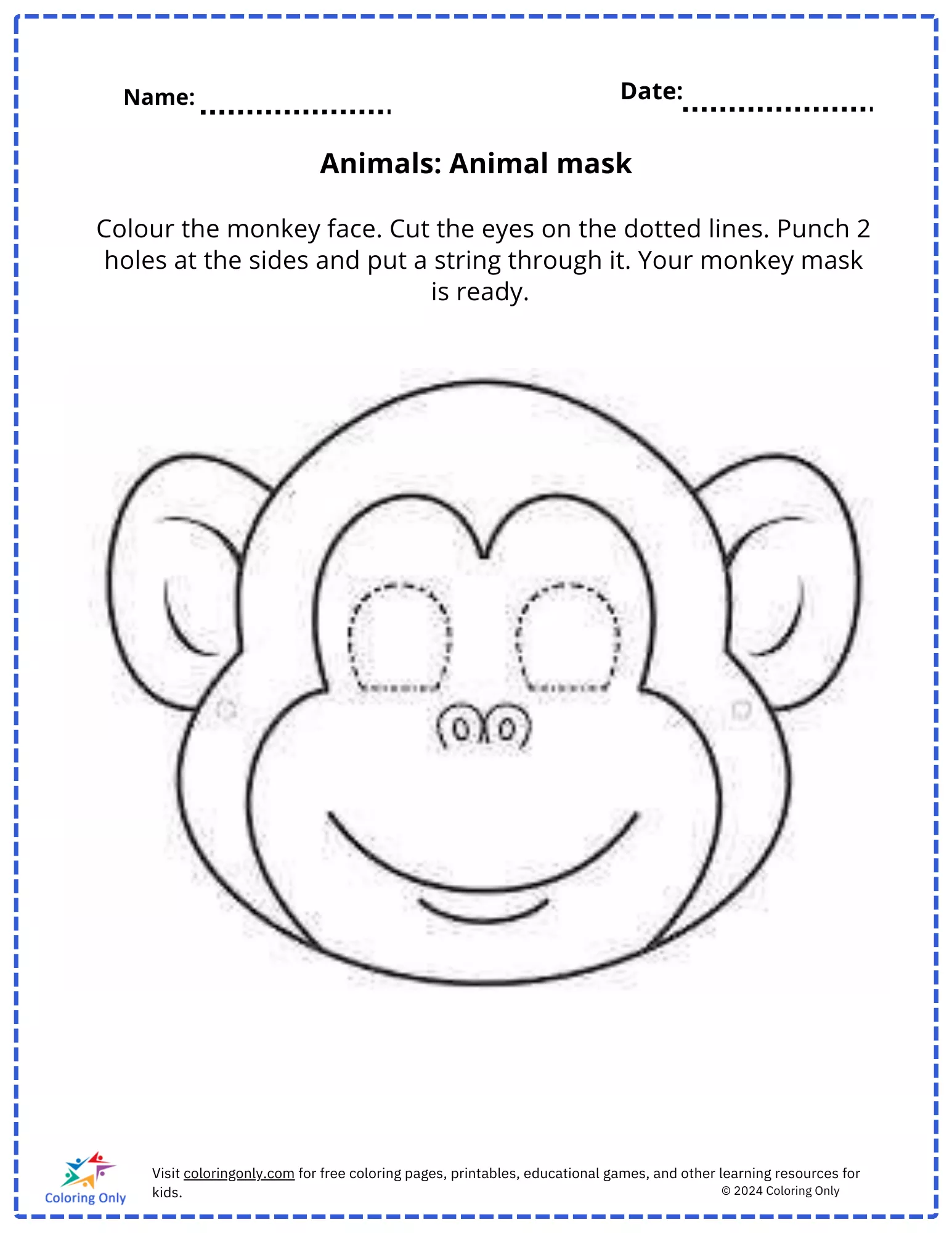 The "Animals: Animal Mask Free Printable Worksheet" is a fun and creative activity designed for kindergarten students. This worksheet features a monkey face that children can color and then transform into a mask. After coloring, kids can cut out the eyes on the dotted lines, punch two holes at the sides, and thread a string through them to create their very own monkey mask. The "Animals: Animal Mask Free Printable Worksheet" is perfect for imaginative play and helps children develop fine motor skills and creativity. It's an engaging way to introduce kids to the world of animals while providing a hands-on crafting experience.