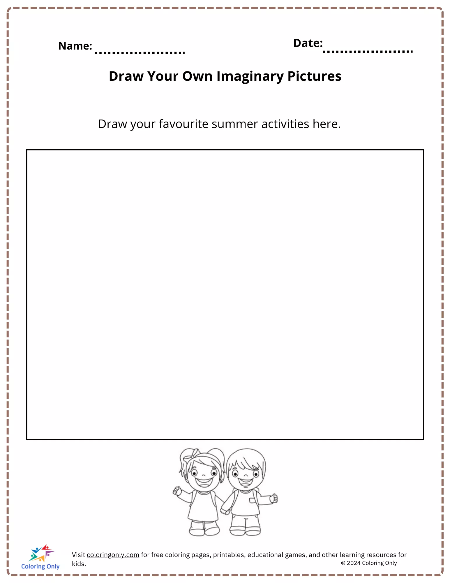 The "Draw Your Own Imaginary Pictures Free Printable Worksheet" is a creative and open-ended activity designed for kindergarten students. This worksheet provides a blank canvas where children can draw their favorite summer activities or anything their imagination conjures up. It's perfect for encouraging creativity, self-expression, and artistic skills in young learners. Whether they want to draw a day at the beach, playing with friends, or a fun adventure, this "Draw Your Own Imaginary Pictures Free Printable Worksheet" offers endless possibilities for kids to explore their imagination.