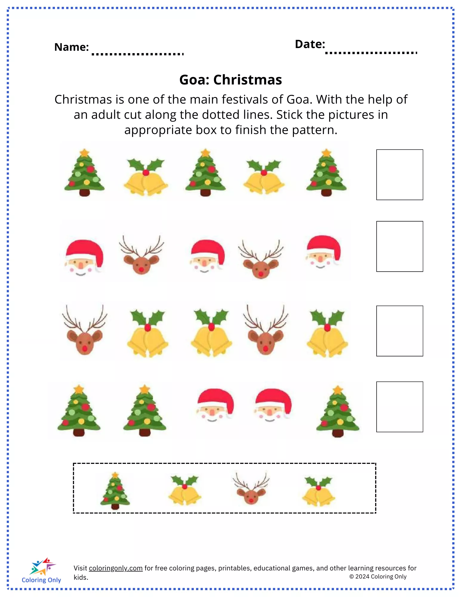 Celebrate the festive spirit with our "Goa: Christmas Free Printable Worksheet"! This delightful worksheet is specially designed for kindergarteners to enjoy the joy of Christmas while enhancing their pattern recognition skills. The "Goa: Christmas Free Printable Worksheet" features vibrant Christmas-themed images that children can cut out and stick to complete the patterns. This engaging activity not only brings the magic of Goa's Christmas celebrations into the classroom but also helps develop fine motor skills and cognitive abilities. Perfect for both classroom use and at-home fun, the "Goa: Christmas Free Printable Worksheet" is an excellent resource for holiday learning. Download your copy today and let the festive fun begin!
