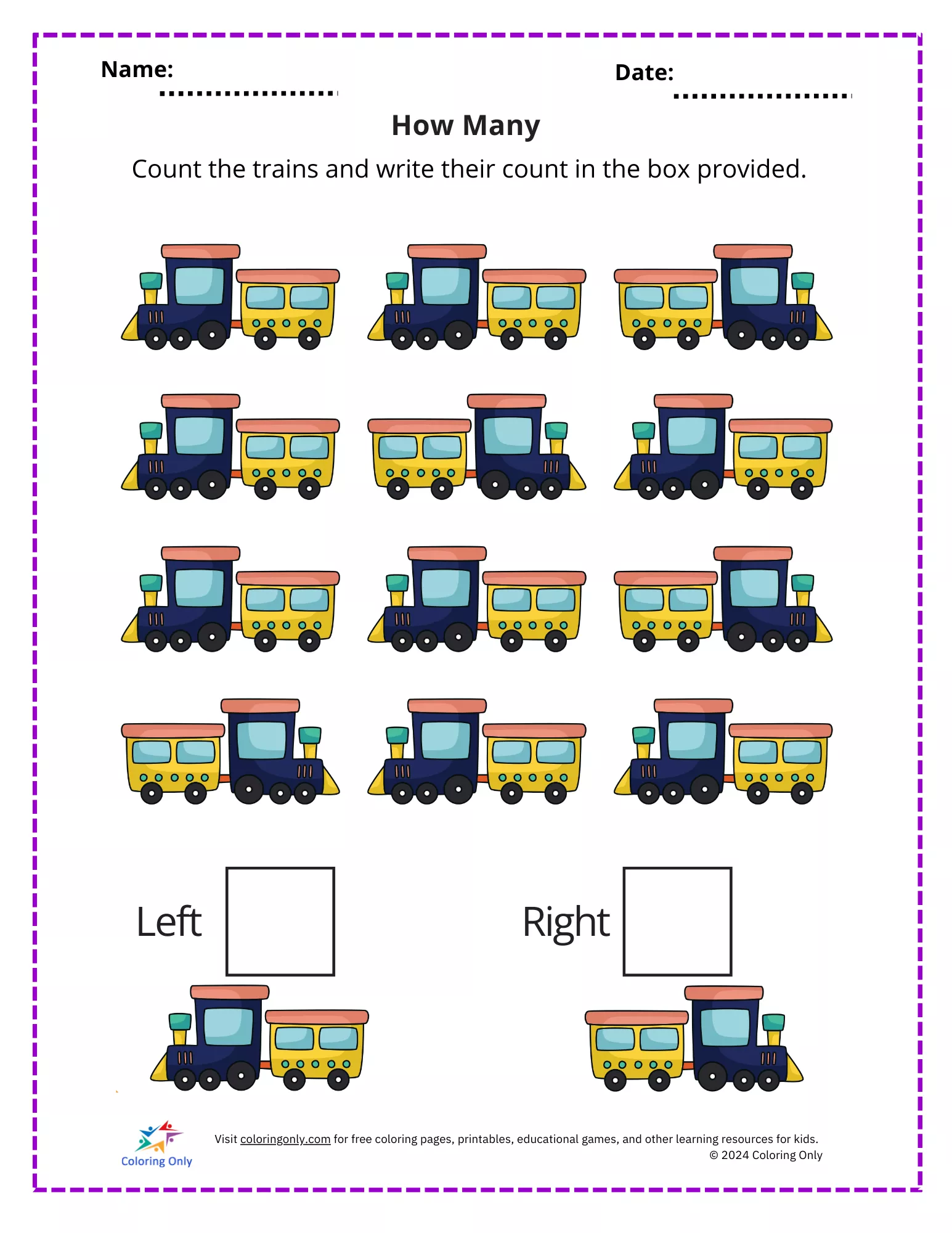 Make counting fun for little learners with this How Many Free Printable Worksheet! Perfect for kindergarteners, this engaging activity helps children practice their counting skills by identifying and counting trains. The How Many Free Printable Worksheet encourages early math development, number recognition, and fine motor skills as kids write the correct number in the provided boxes. Ideal for homeschooling, classrooms, or extra practice at home, this worksheet makes learning interactive and enjoyable.