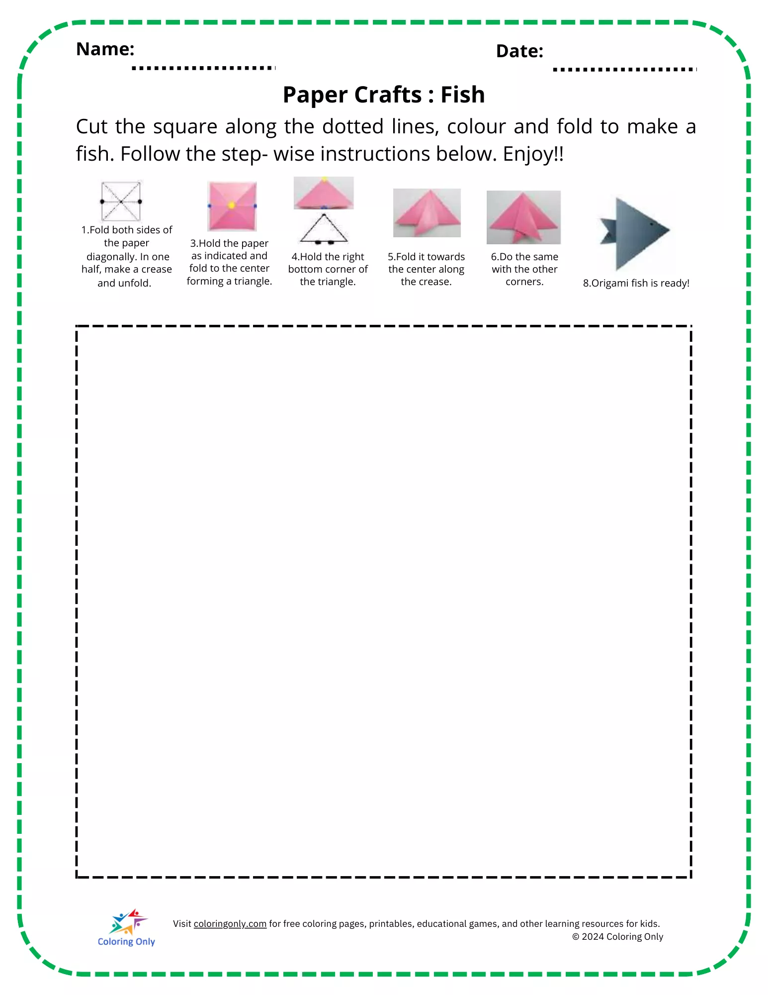Your little ones to the fun world of origami with this Paper Crafts: Fish Free Printable Worksheet! Perfect for kindergarteners, this engaging activity combines creativity and learning. The worksheet provides step-by-step instructions to fold a square paper into a cute fish shape. Kids can cut along the dotted lines, color the paper, and follow the simple folding guide to create their own origami masterpiece. This hands-on craft enhances fine motor skills, boosts concentration, and sparks imagination. Whether at home or in the classroom, this Paper Crafts: Fish Free Printable Worksheet is an enjoyable way to develop artistic skills while having fun.