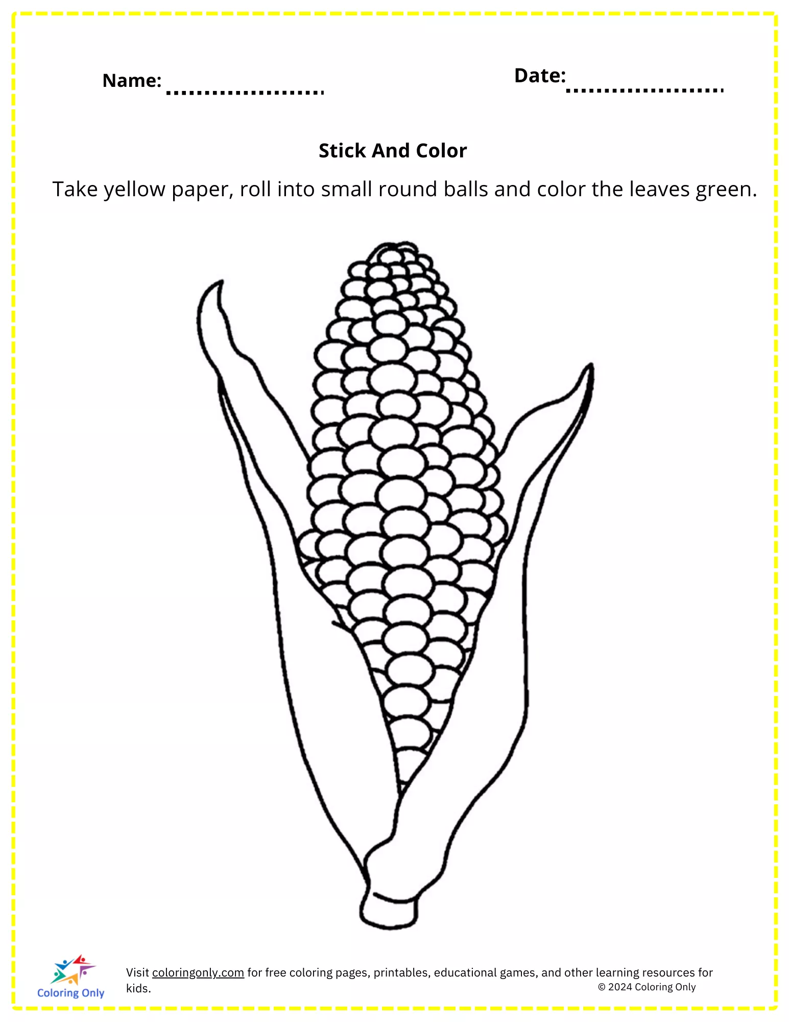 The "Stick And Color Free Printable Worksheet" is a delightful and interactive activity designed specifically for kindergarten students. This worksheet features an image of corn, where children are instructed to take yellow paper, roll it into small round balls, and stick them onto the corn kernels. Additionally, they can color the leaves green, enhancing their fine motor skills and creativity. The "Stick And Color Free Printable Worksheet" is an excellent way to combine art and hands-on learning, making it an engaging exercise that kids will love.