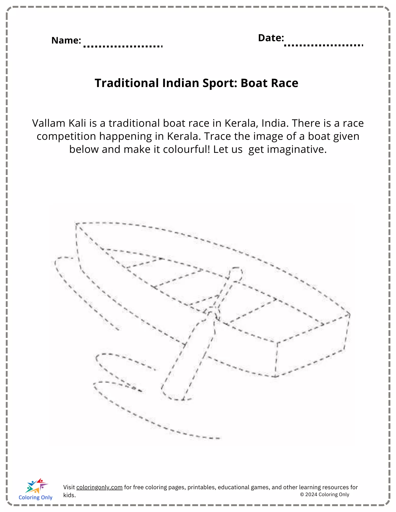 The "Traditional Indian Sport: Boat Race Free Printable Worksheet" is a delightful activity designed for kindergarteners to explore the cultural heritage of India through art. Focusing on the traditional Vallam Kali boat race, this worksheet encourages young learners to trace and color an image of a boat, sparking creativity and fine motor skills. The "Traditional Indian Sport: Boat Race Free Printable Worksheet" provides an engaging way for children to connect with Indian traditions while having fun with colors. Let your child’s imagination flow as they learn about the vibrant boat races of Kerala and bring the scene to life with their artistic touch.