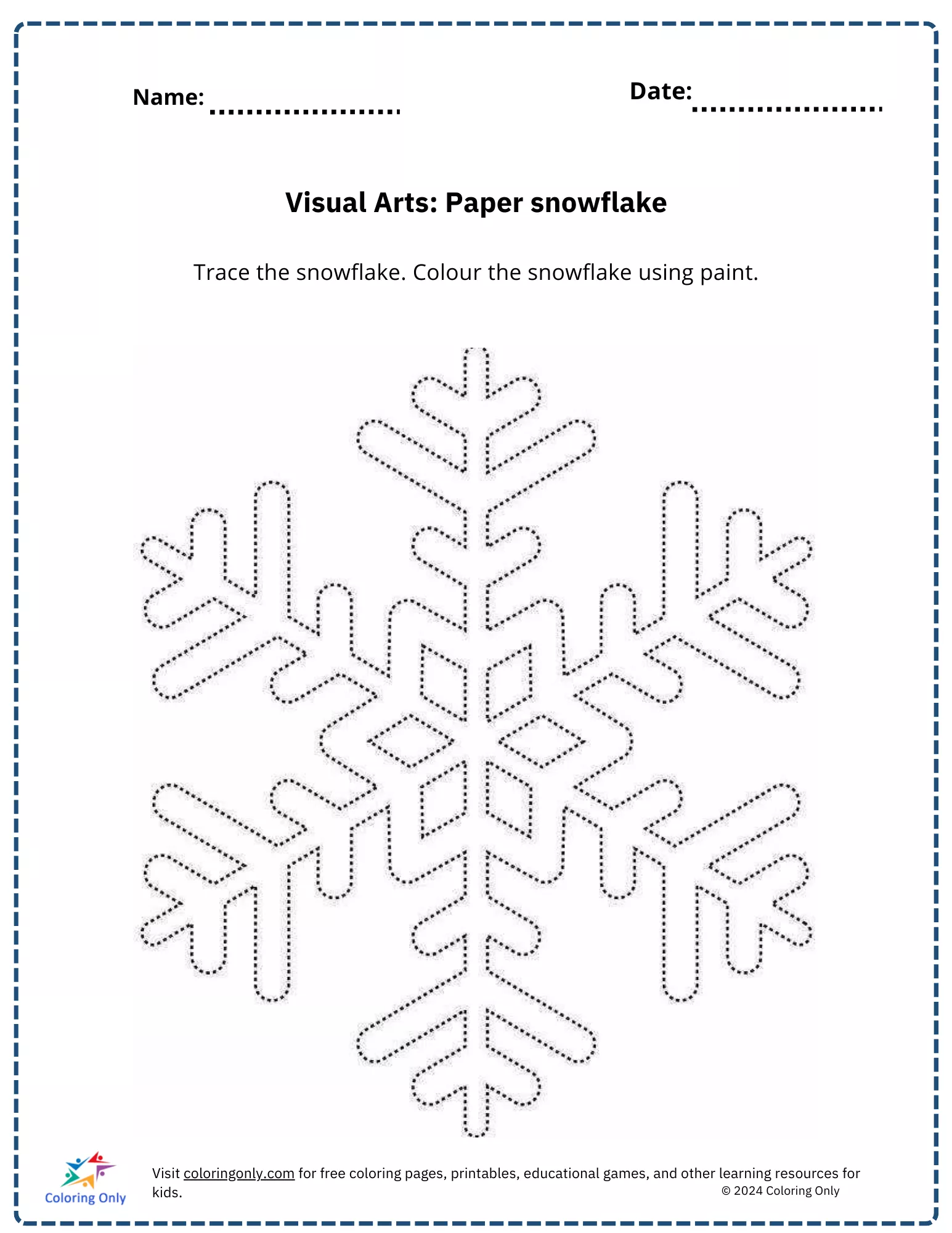 The "Visual Arts: Paper Snowflake Free Printable Worksheet" is a delightful activity designed for kindergarten students. This worksheet encourages children to trace and color a beautiful snowflake design, making it perfect for developing fine motor skills and sparking creativity. By tracing the dotted lines, students can improve their hand-eye coordination, and using paints to color the snowflake allows them to express their artistic flair. This "Visual Arts: Paper Snowflake Free Printable Worksheet" is ideal for introducing young learners to visual arts through a fun and engaging winter-themed craft.