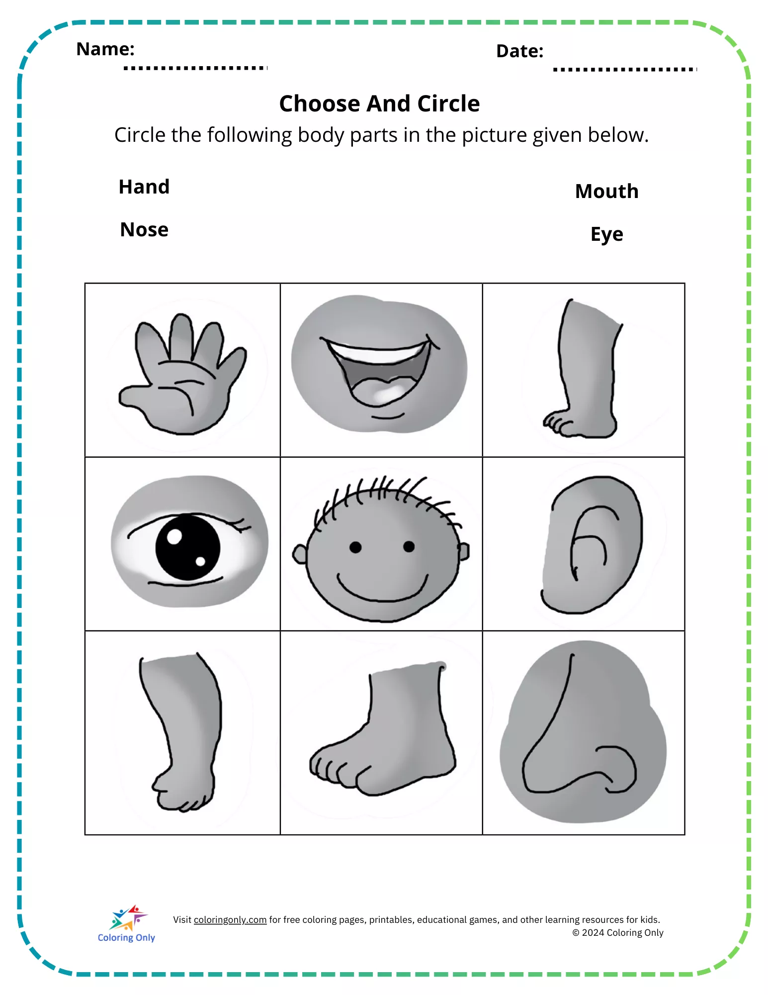 This Choose And Circle Free Printable Worksheet is a fun and educational activity for kindergarteners to learn about body parts. Children will circle the correct images of a hand, mouth, nose, and eye from the provided grid, enhancing their recognition and observation skills. This worksheet helps young learners develop early anatomy awareness while improving their fine motor skills. Ideal for classrooms or home learning, the Choose And Circle Free Printable Worksheet makes learning interactive and engaging for kids.
