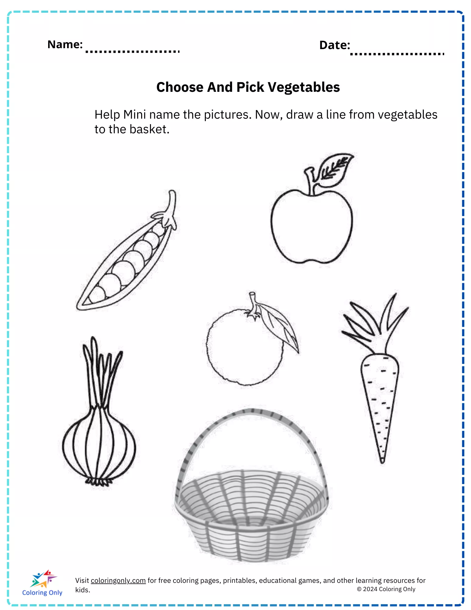 The Choose And Pick Vegetables Free Printable Worksheet is an engaging and educational activity for kindergarten students. This worksheet helps children learn how to identify different vegetables and match them to a basket. Kids are encouraged to draw a line connecting the vegetables to the basket, reinforcing their understanding of vegetables and developing their fine motor skills. The Choose And Pick Vegetables Free Printable Worksheet is a great tool for teachers and parents to teach kids about healthy foods while making learning interactive and fun.