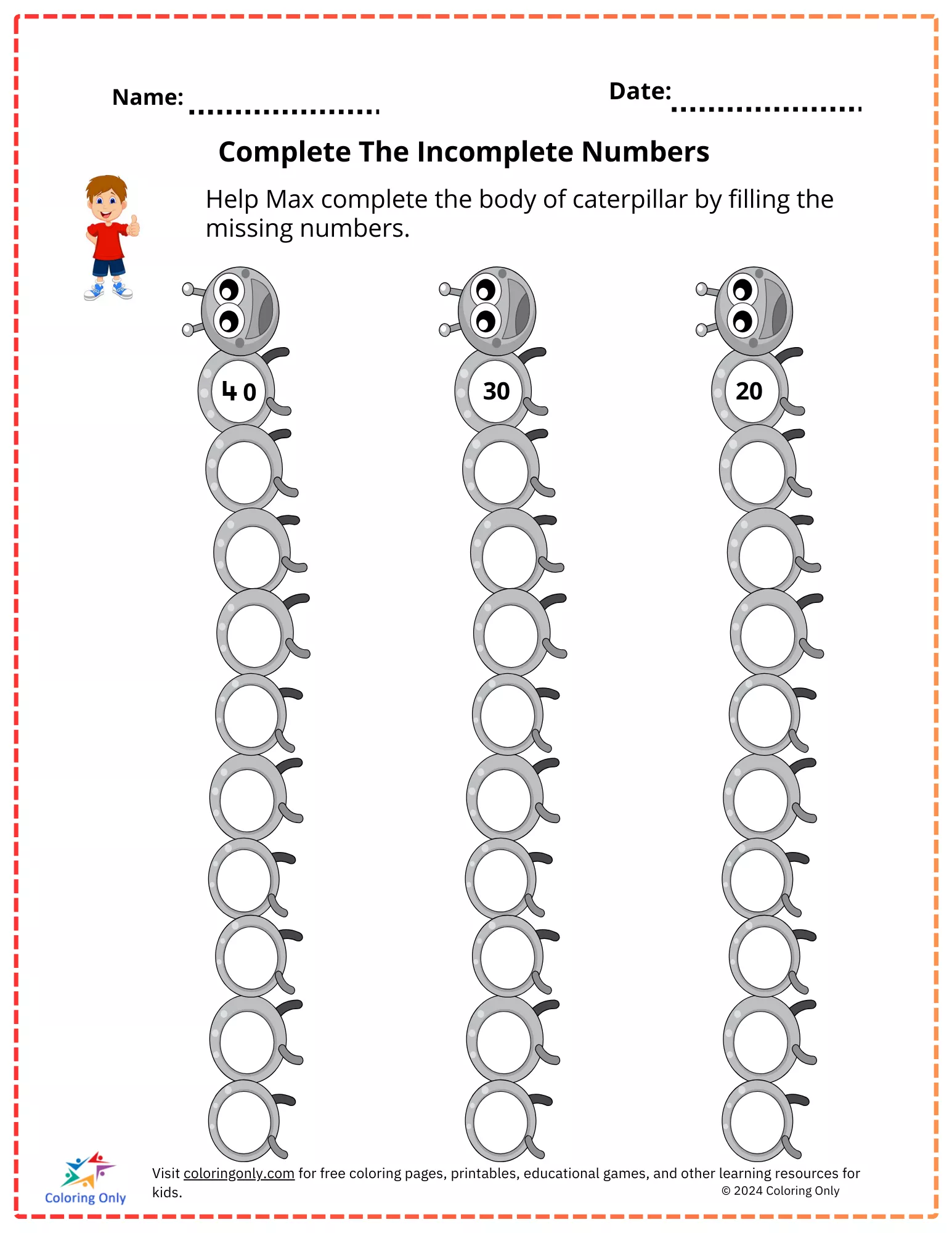 Enhance your child's number sequencing skills with our "Complete The Incomplete Numbers Free Printable Worksheet"! Designed for kindergarteners, this fun and engaging worksheet helps children practice filling in missing numbers to complete the body of a caterpillar. The "Complete The Incomplete Numbers Free Printable Worksheet" features three caterpillar sequences starting from 10, 20, and 30, encouraging kids to identify and write the missing numbers. This activity boosts counting skills, number recognition, and logical thinking. Perfect for both classroom use and at-home learning, the "Complete The Incomplete Numbers Free Printable Worksheet" provides a delightful way to reinforce foundational math skills. Download your copy today and watch your child's confidence in numbers grow