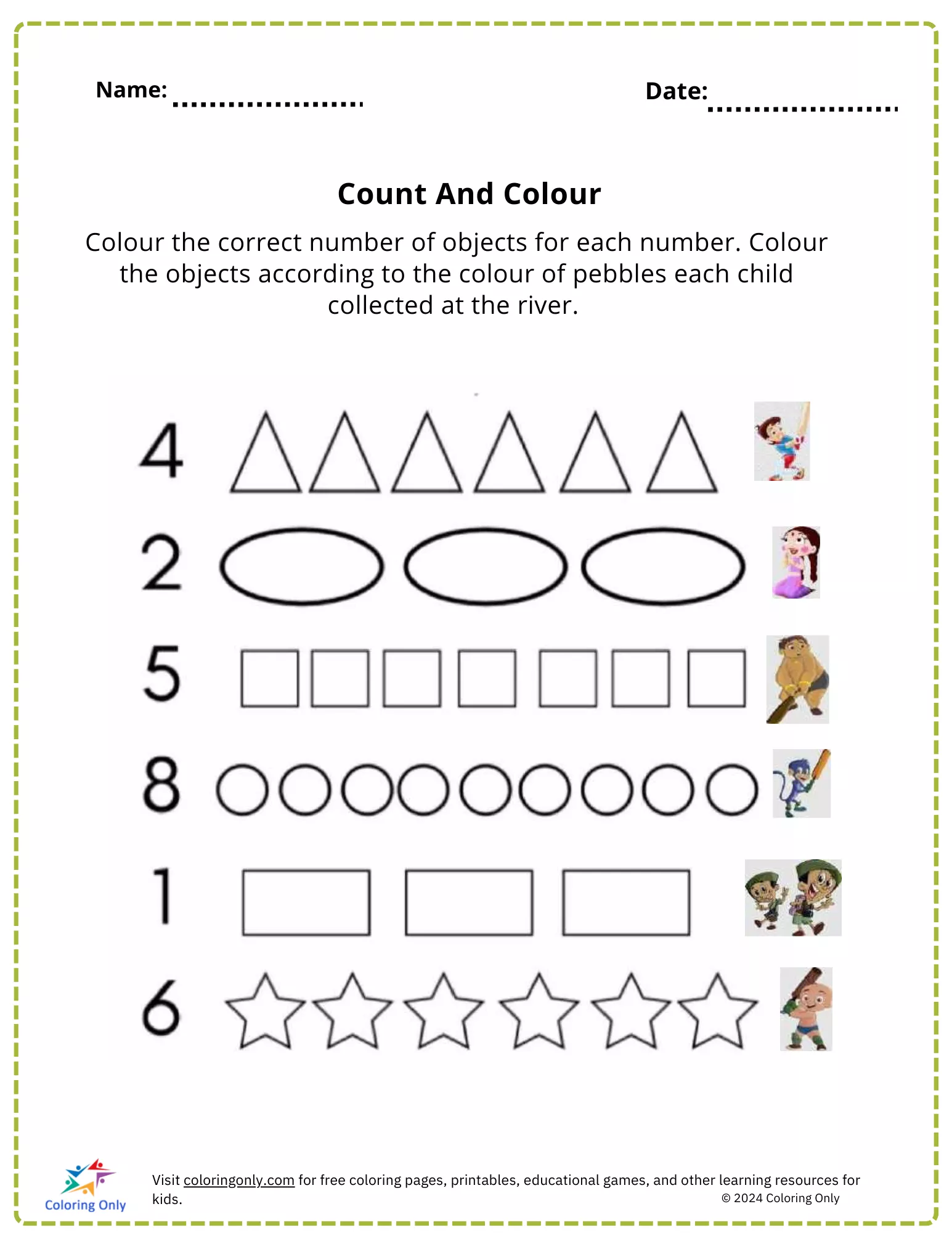 The Count And Colour Free Printable Worksheet is a fun and interactive activity designed for kindergarteners to practice counting and coloring. Children are tasked with counting the objects in each row, such as triangles, squares, and stars, and then coloring the correct number according to the instructions. This engaging worksheet helps reinforce early math skills, including number recognition and counting, while also developing fine motor skills through coloring. The Count And Colour Free Printable Worksheet is ideal for both classroom and at-home learning, offering a creative way to build foundational math concepts.