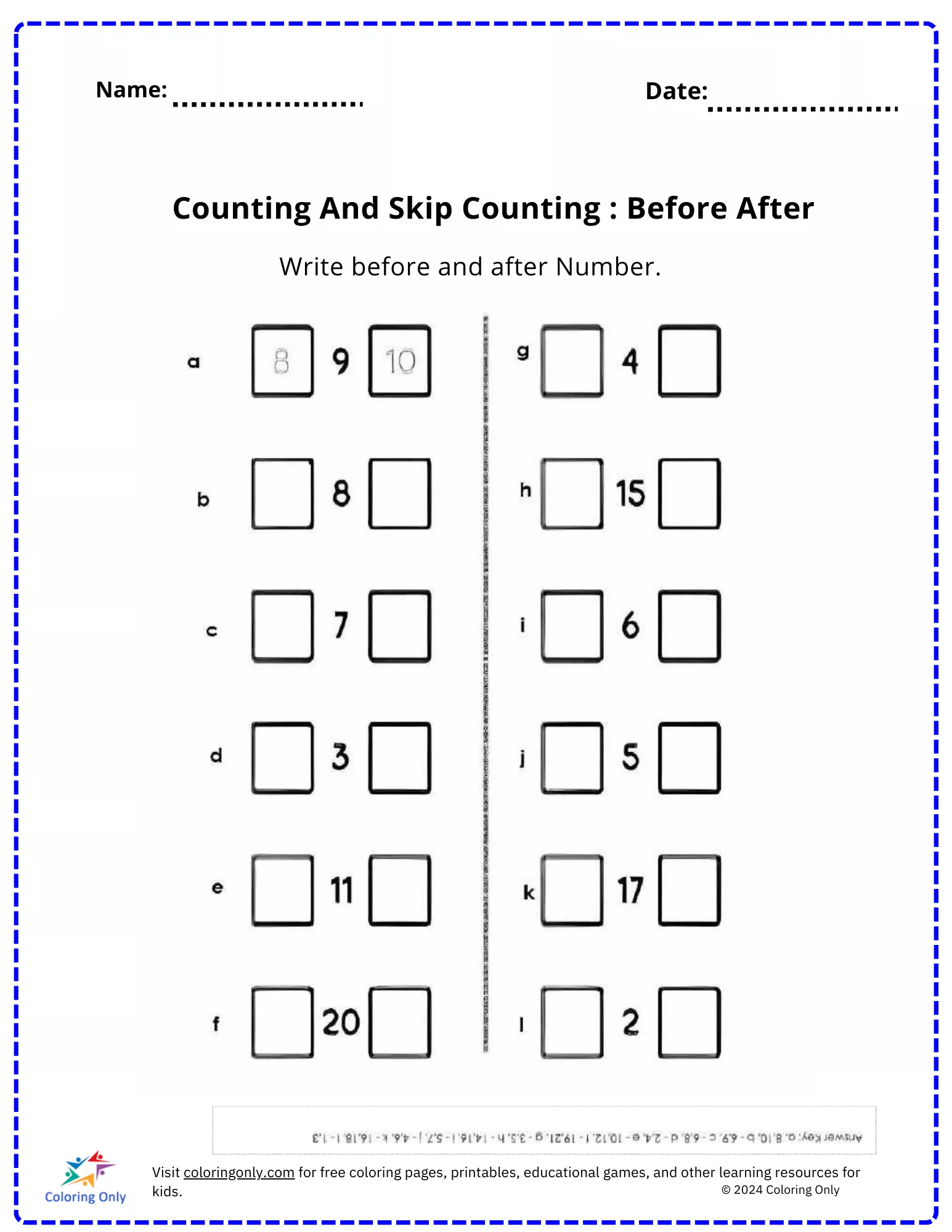 The Counting And Skip Counting: Before After Free Printable Worksheet is designed to help kindergarten students practice their number sequencing skills. This worksheet asks children to write the numbers that come before and after a given number, reinforcing both counting and skip-counting concepts. It’s an interactive and engaging way to solidify their understanding of number patterns while enhancing their ability to recognize number sequences. Perfect for use in classrooms or at home, the Counting And Skip Counting: Before After Free Printable Worksheet makes learning fun and supports foundational math skills in young learners.