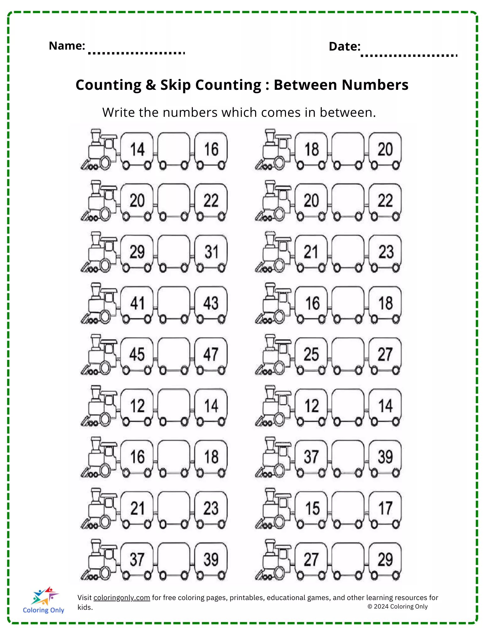 The Counting & Skip Counting: Between Numbers Free Printable Worksheet is a great tool for kindergarten students to practice their number sequence skills. This fun and educational worksheet encourages children to fill in the missing numbers between a given number range, reinforcing their understanding of both counting and skip counting. Featuring an engaging train theme, it makes learning more interactive and exciting for young learners. The Counting & Skip Counting: Between Numbers Free Printable Worksheet is perfect for classroom activities or home practice, helping kids build essential math skills.