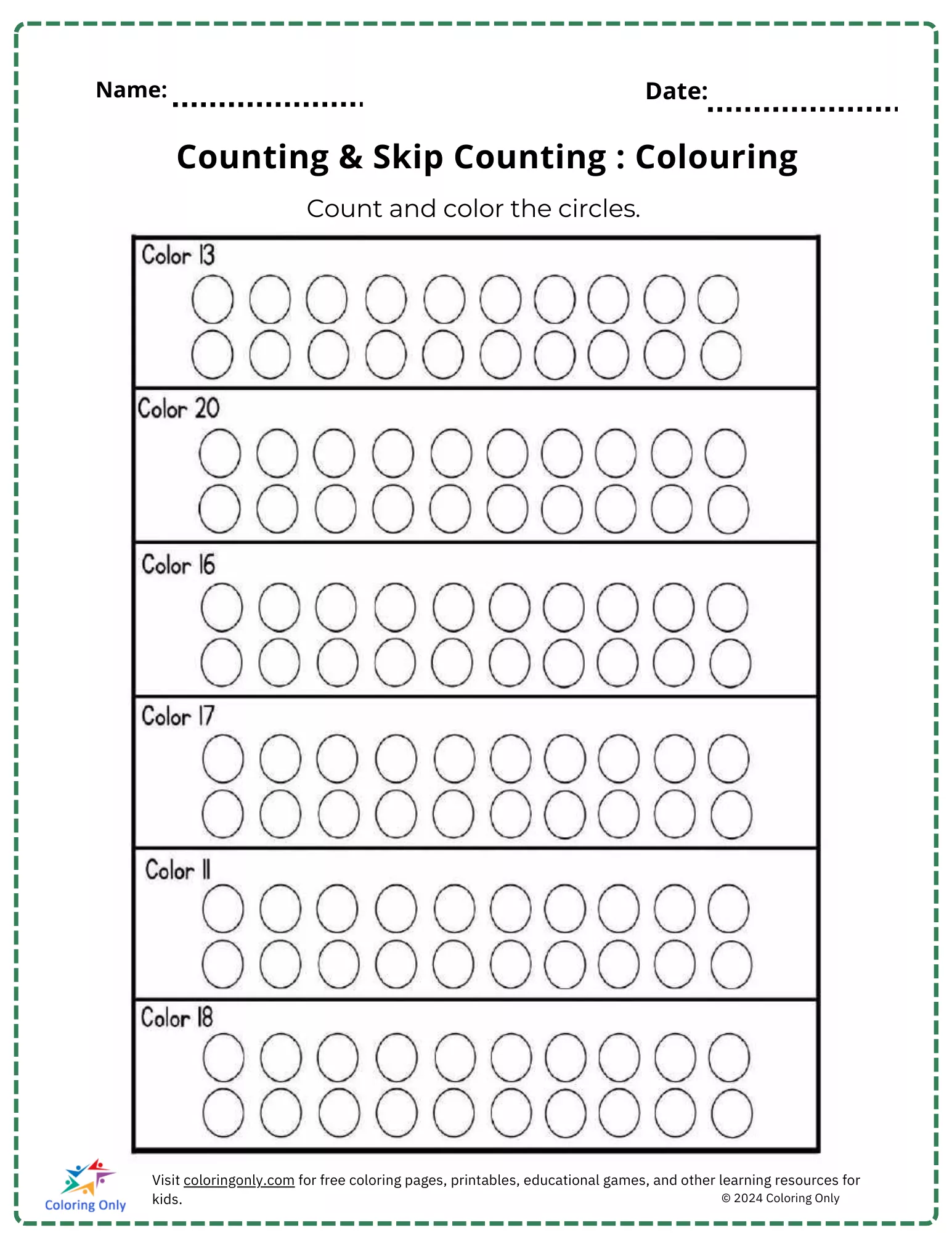 The Counting & Skip Counting: Colouring Free Printable Worksheet is a fantastic tool for kindergarteners to practice counting and skip counting in a fun and engaging way. Children are asked to count and color the correct number of circles for each row, enhancing their understanding of numbers and skip counting patterns. This Counting & Skip Counting: Colouring Free Printable Worksheet supports early math skills, number recognition, and fine motor development, making it perfect for both classroom and home learning environments.