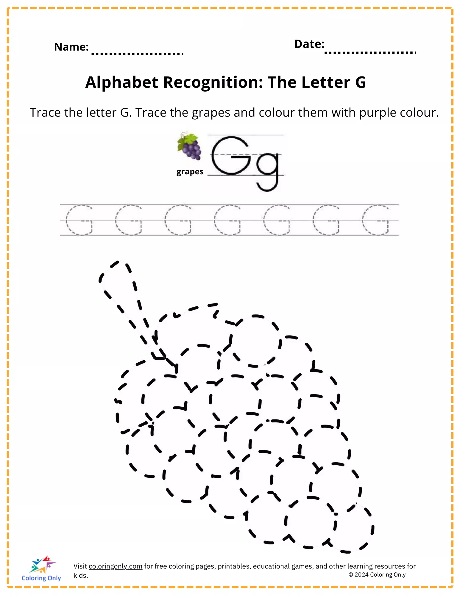 Help your preschooler master the alphabet with our "Alphabet Recognition: The Letter G Free Printable Worksheet." This fun and educational worksheet focuses on the letter G, offering a tracing activity that helps children practice writing both uppercase and lowercase G. Additionally, it includes a creative task where kids trace a bunch of grapes and then color them with purple, reinforcing the association between the letter G and the word "grapes." The "Alphabet Recognition: The Letter G Free Printable Worksheet" supports early literacy development and fine motor skills in an engaging way. Perfect for use at home or in the classroom, this worksheet makes learning the alphabet an enjoyable and interactive experience. Download and print this free resource to add to your preschooler's learning activities!