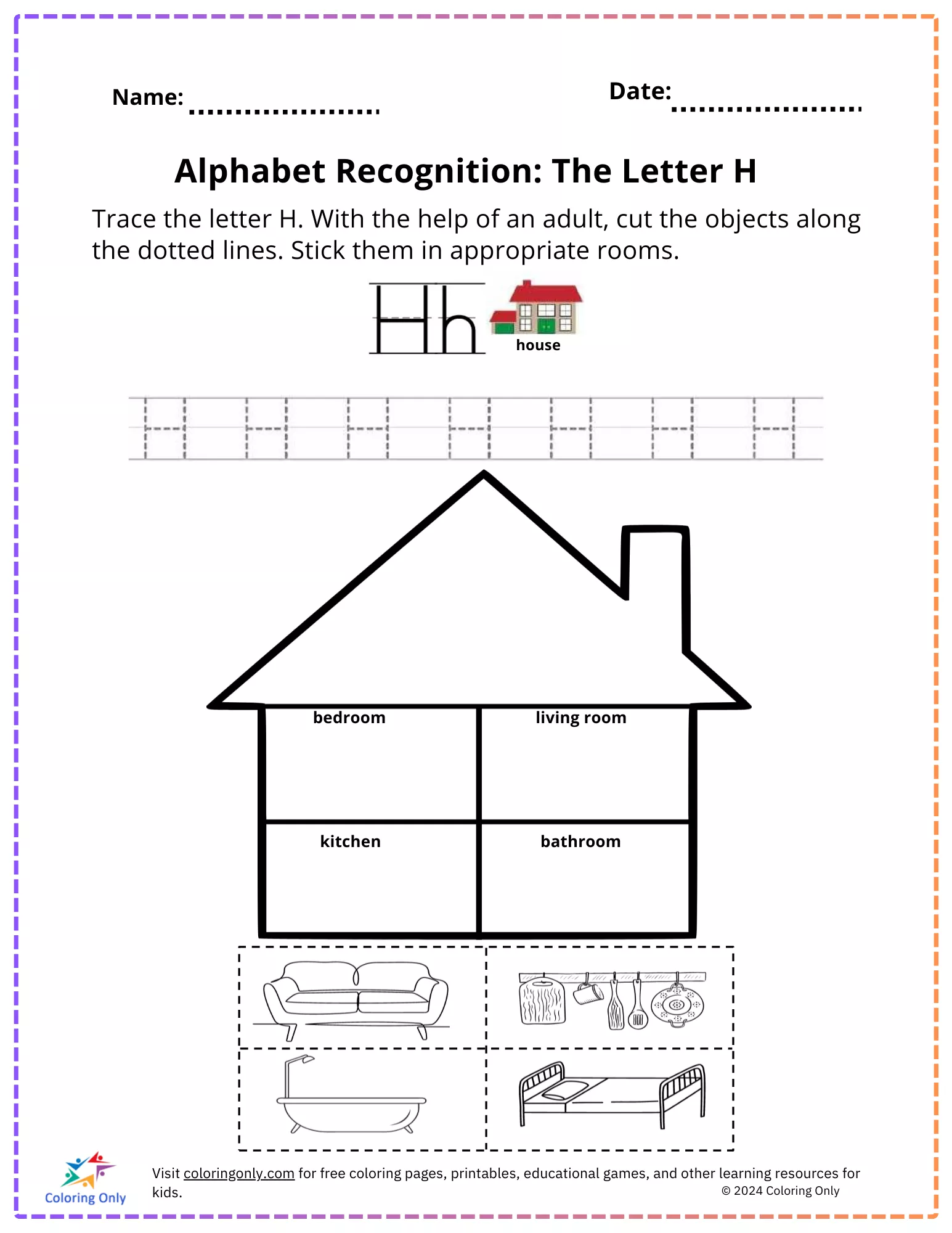 Enhance your preschooler's alphabet skills with our "Alphabet Recognition: The Letter H Free Printable Worksheet." This engaging activity sheet focuses on the letter H, featuring a tracing exercise to help children practice writing both uppercase and lowercase H. Additionally, the worksheet includes a fun cut-and-paste activity where kids, with the help of an adult, can cut out pictures of household items and stick them in the appropriate rooms of a house diagram. This "Alphabet Recognition: The Letter H Free Printable Worksheet" not only supports letter recognition and fine motor skills but also helps children learn about household objects and their placement. Perfect for both classroom and home use, this worksheet makes learning interactive and enjoyable. Download and print this free resource to enrich your preschooler's educational experience
