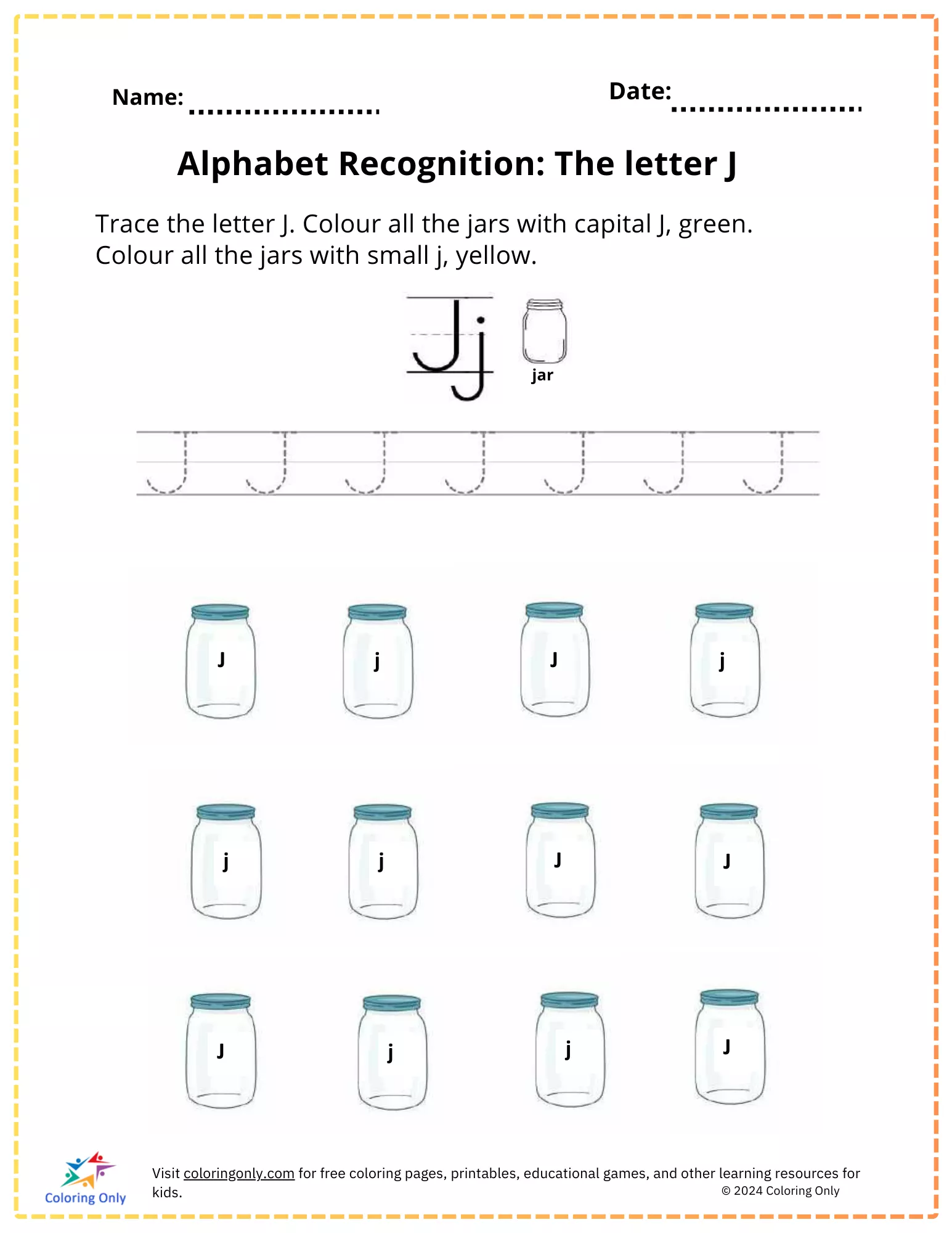 Enhance your preschooler's alphabet learning with our "Alphabet Recognition: The Letter J Free Printable Worksheet." This engaging worksheet helps children practice writing the letter J through tracing exercises and also includes a fun coloring activity. Kids are instructed to color all jars with a capital J in green and jars with a lowercase j in yellow, reinforcing their recognition of uppercase and lowercase letters. The "Alphabet Recognition: The Letter J Free Printable Worksheet" supports early literacy development and fine motor skills in a fun and interactive way. Perfect for both home and classroom use, this worksheet makes learning the alphabet an enjoyable experience for young learners. Download and print this free resource to add some educational fun to your preschooler's day
