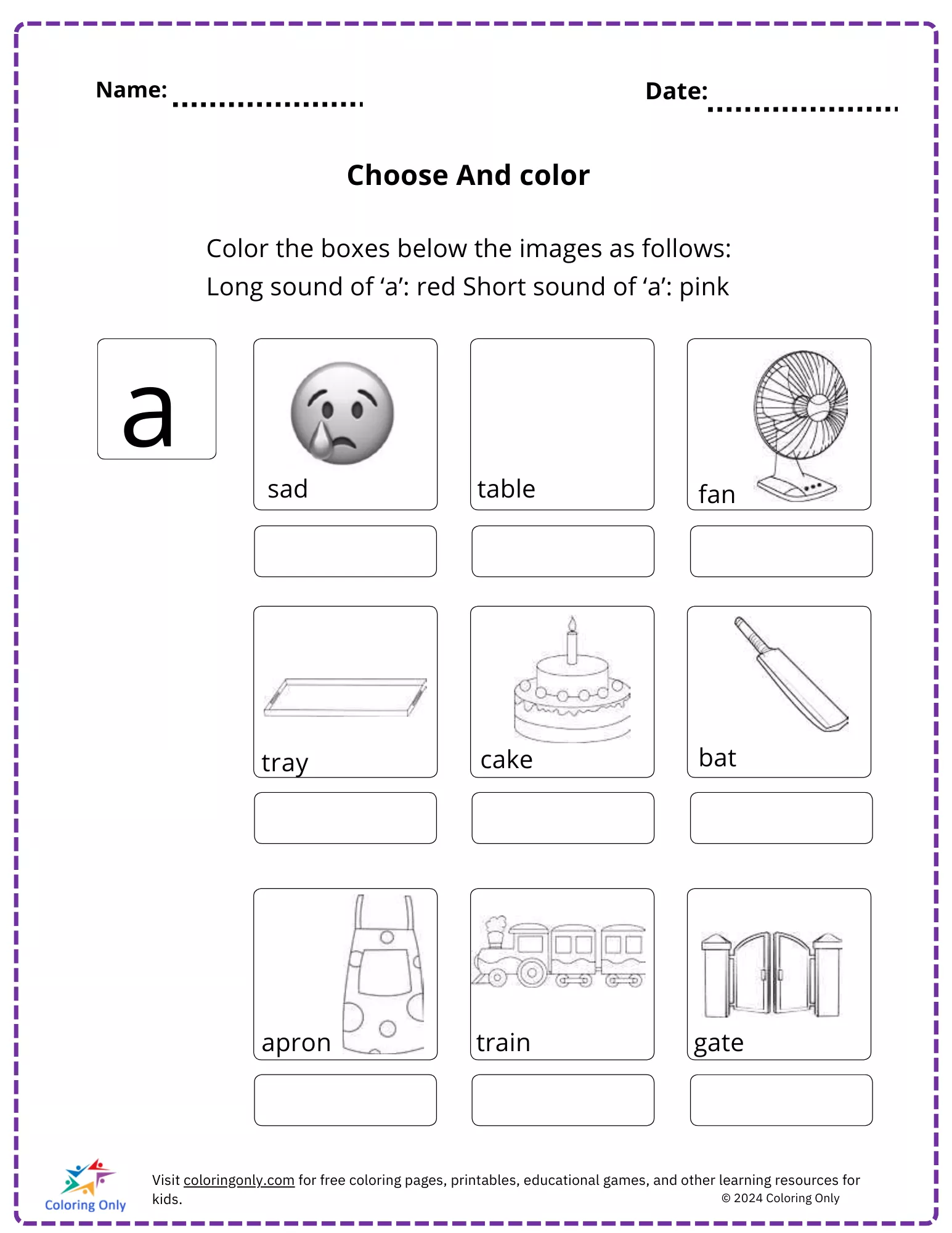 The Choose And Color free Printable Worksheet is a fun and interactive activity designed for kindergarten students to help them differentiate between long and short vowel sounds. In this worksheet, children are instructed to color the boxes under each image based on the sound of the letter 'a'—red for the long sound and pink for the short sound. This Choose And Color free Printable Worksheet is perfect for improving phonetic awareness and fine motor skills as children explore vowel sounds while engaging in a colorful activity.