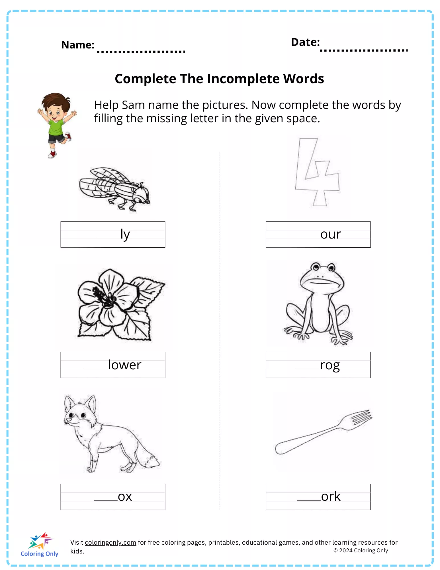 The "Complete The Incomplete Word Free Printable Worksheet" is a fun and interactive activity designed to help kindergarten students practice early literacy skills. Children will be tasked with identifying the pictures provided and completing the corresponding words by filling in the missing letters. This worksheet offers a playful approach to learning, encouraging children to improve their spelling, word recognition, and phonics skills. The "Complete The Incomplete Word Free Printable Worksheet" is perfect for building confidence in young learners as they expand their vocabulary in an engaging and educational format.