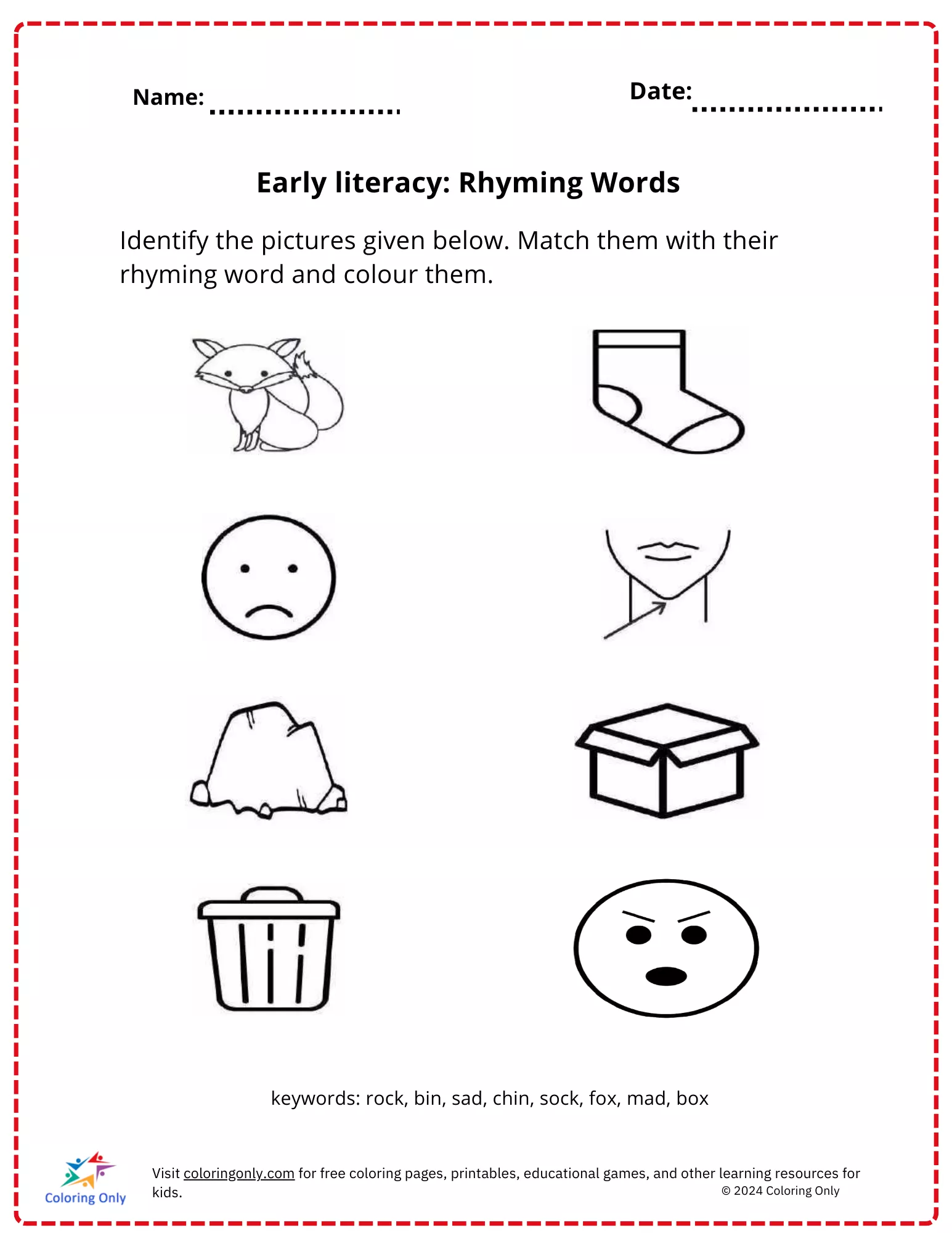 The "Early literacy: Rhyming Words Free Printable Worksheet" is a fun and educational tool designed for kindergarten students. This worksheet helps children develop early literacy skills by encouraging them to identify pictures and match them with their rhyming words. With images of familiar objects like a fox, sock, and box, children can easily associate sounds and build their vocabulary. As an added activity, kids are invited to color the pictures after matching. This "Early literacy: Rhyming Words Free Printable Worksheet" makes learning engaging while promoting phonetic awareness.