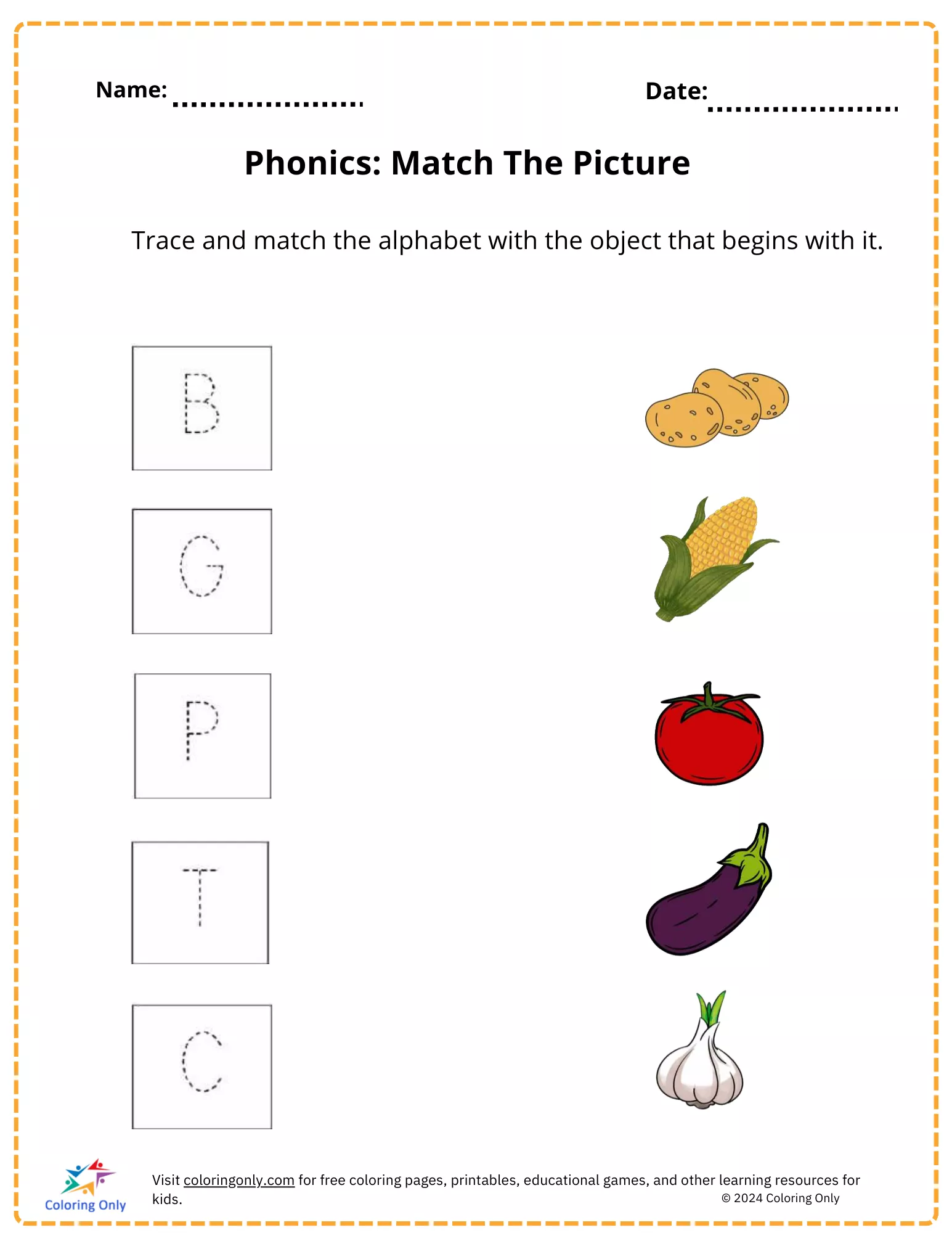 The Phonics: Match The Picture Free Printable Worksheet is a fun and educational activity designed to help kindergarteners practice their letter recognition and phonics skills. Children will trace each letter and match it with the picture of an object that starts with that letter. Featuring objects like potatoes, corn, and tomatoes, this worksheet makes learning interactive and engaging. The Phonics: Match The Picture Free Printable Worksheet is perfect for use in the classroom or at home to reinforce early literacy skills and improve letter-sound association.