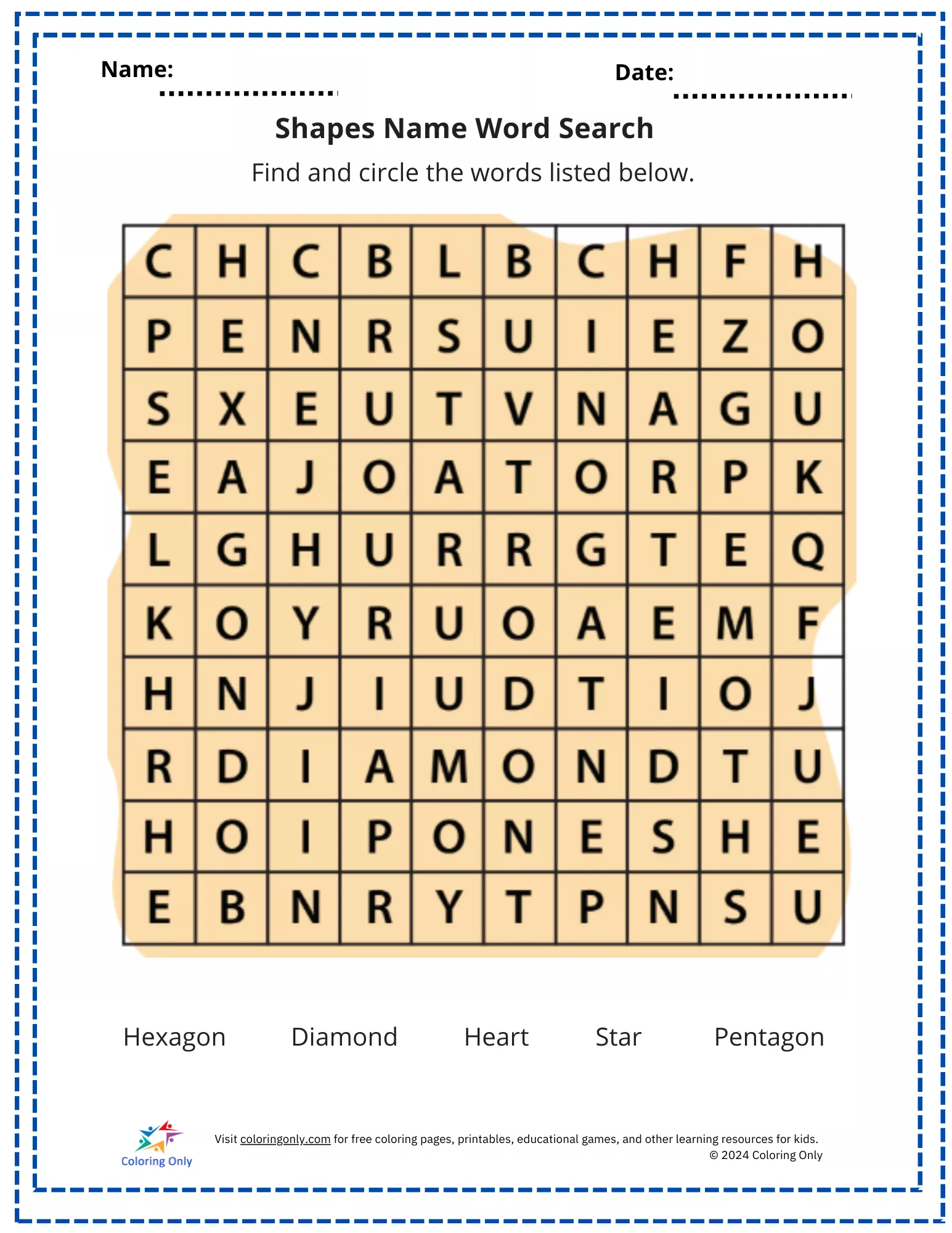 Kids learn shape names in a fun way with this Shapes Name Word Search Free Printable Worksheet! This engaging activity encourages kindergarteners to recognize and spell common shape names while improving their word-search skills. The Shapes Name Word Search Free Printable Worksheet supports early learning by enhancing vocabulary, letter recognition, and problem-solving abilities. Ideal for classrooms, homeschooling, or extra practice at home, this worksheet features shape names like hexagon, diamond, heart, star, and pentagon. A perfect resource to make learning shapes interactive and enjoyable.
