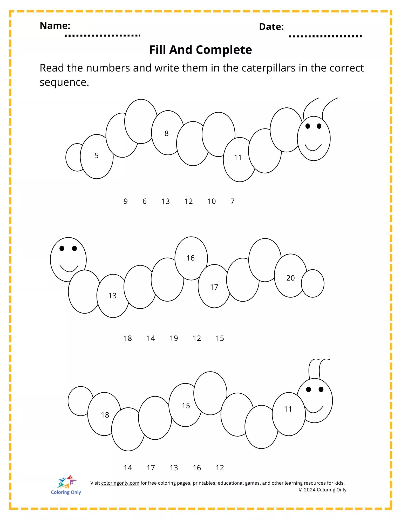 Make number sequencing fun with this Fill And Complete Free Printable Worksheet! Designed for kindergarteners, this engaging activity helps kids practice number order by filling in the missing numbers on the caterpillars. With a mix of given numbers and blank spaces, children will develop their counting, number recognition, and sequencing skills. Whether at home or in the classroom, this Fill And Complete Free Printable Worksheet is a perfect way to reinforce early math concepts while keeping learning enjoyable.