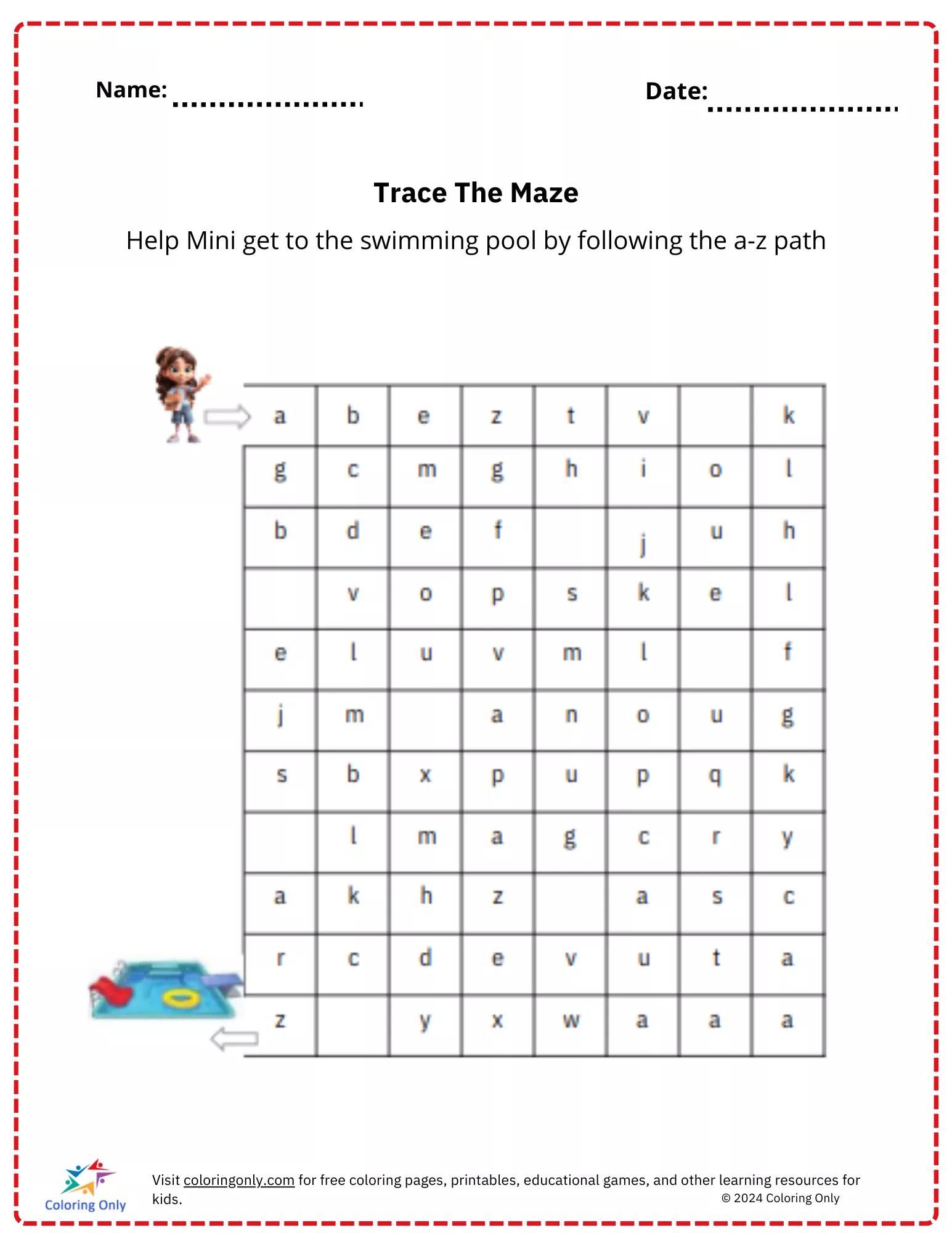 This Trace The Maze free Printable Worksheet offers a fun and educational challenge for kindergarteners. The objective is to help Mini get to the swimming pool by following the path from A to Z. This worksheet enhances letter recognition, sequencing, and critical thinking skills as children trace their way through the maze. Perfect for early learners, this Trace The Maze free Printable Worksheet not only builds fine motor skills but also improves focus and hand-eye coordination. It’s a great activity for both classroom and home learning environments.