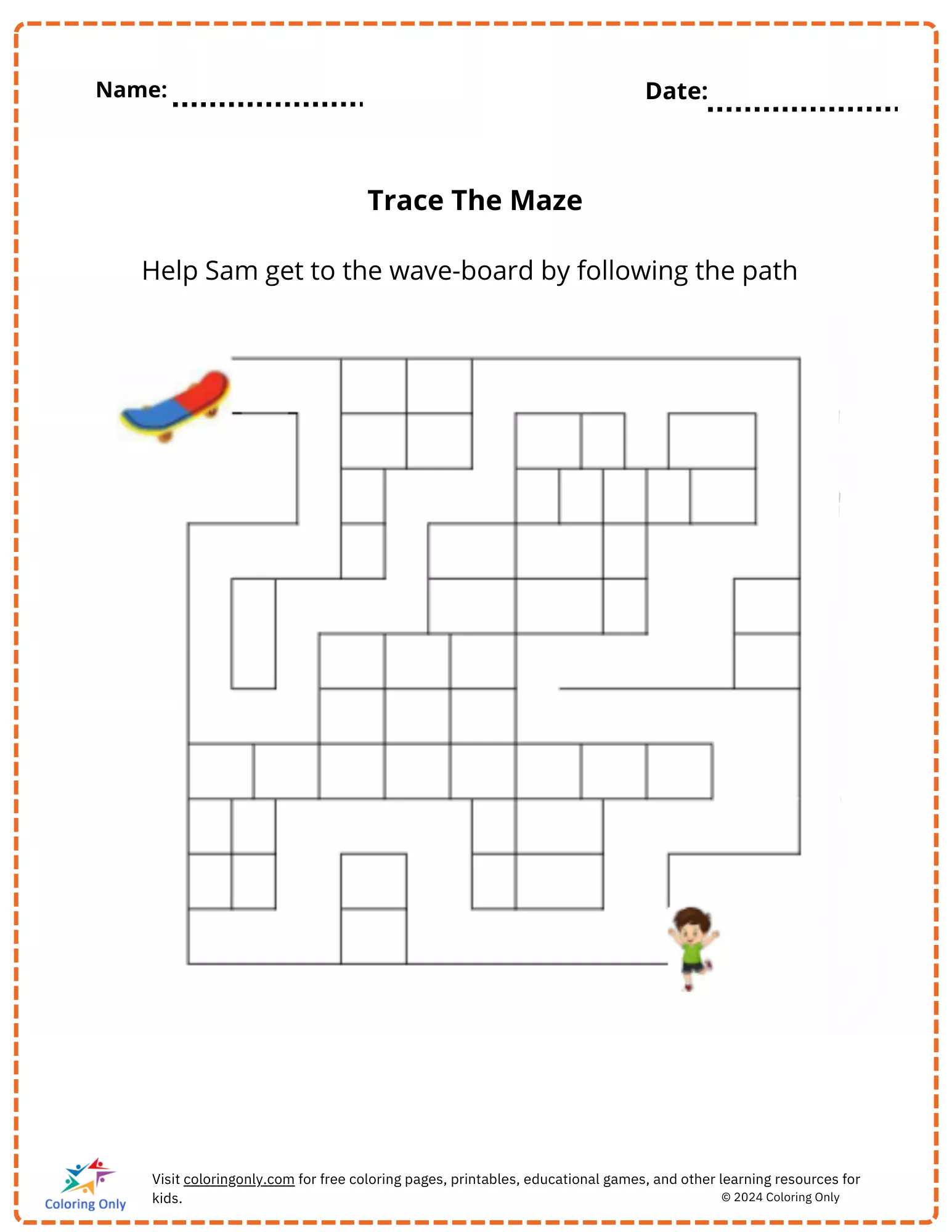 This Trace The Maze free Printable Worksheet is a perfect activity to engage kindergarteners in developing their problem-solving and fine motor skills. The goal is to help Sam reach the wave-board by following the correct path through the maze. This worksheet enhances a child's ability to concentrate, navigate, and think critically while having fun. Ideal for use in the classroom or at home, this Trace The Maze free Printable Worksheet offers both entertainment and educational value, making learning enjoyable for young children.