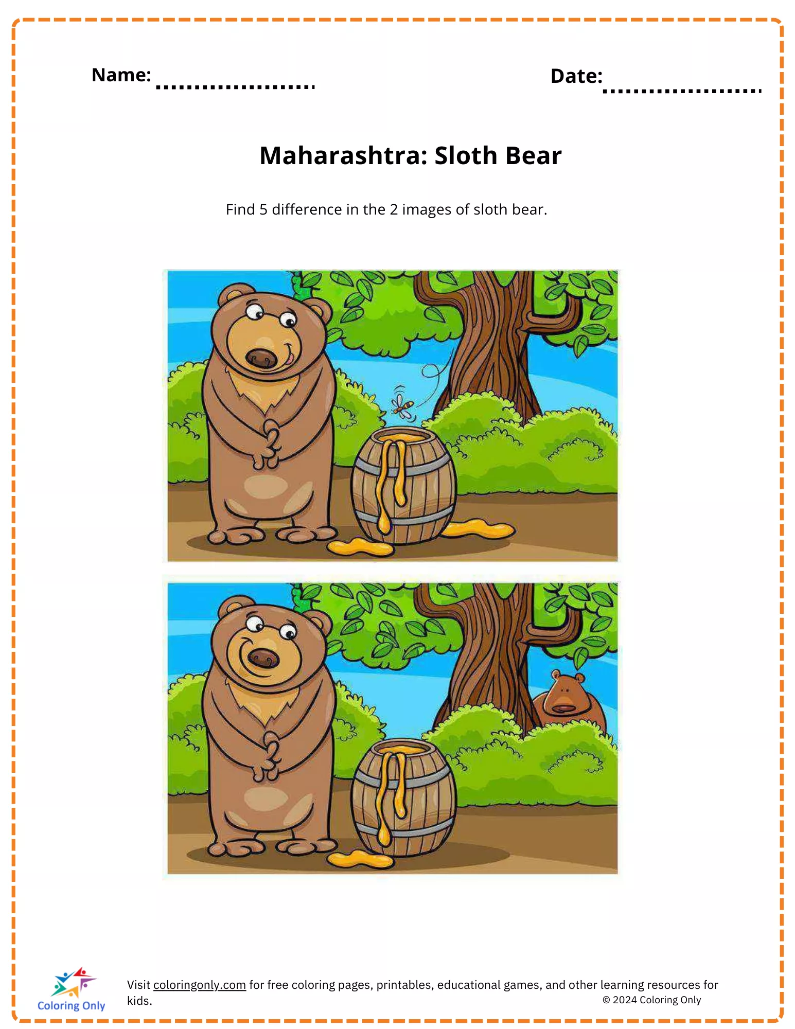 The Maharashtra: Sloth Bear free Printable Worksheet is a fun and engaging activity designed for young learners to develop their observation and attention to detail. Children are tasked with finding five differences between two colorful images of the sloth bear, an animal native to Maharashtra. This activity enhances visual discrimination skills while introducing children to one of the state's fascinating wildlife species. The Maharashtra: Sloth Bear free Printable Worksheet is perfect for kindergarten students and can be used in the classroom or at home as a fun learning tool.