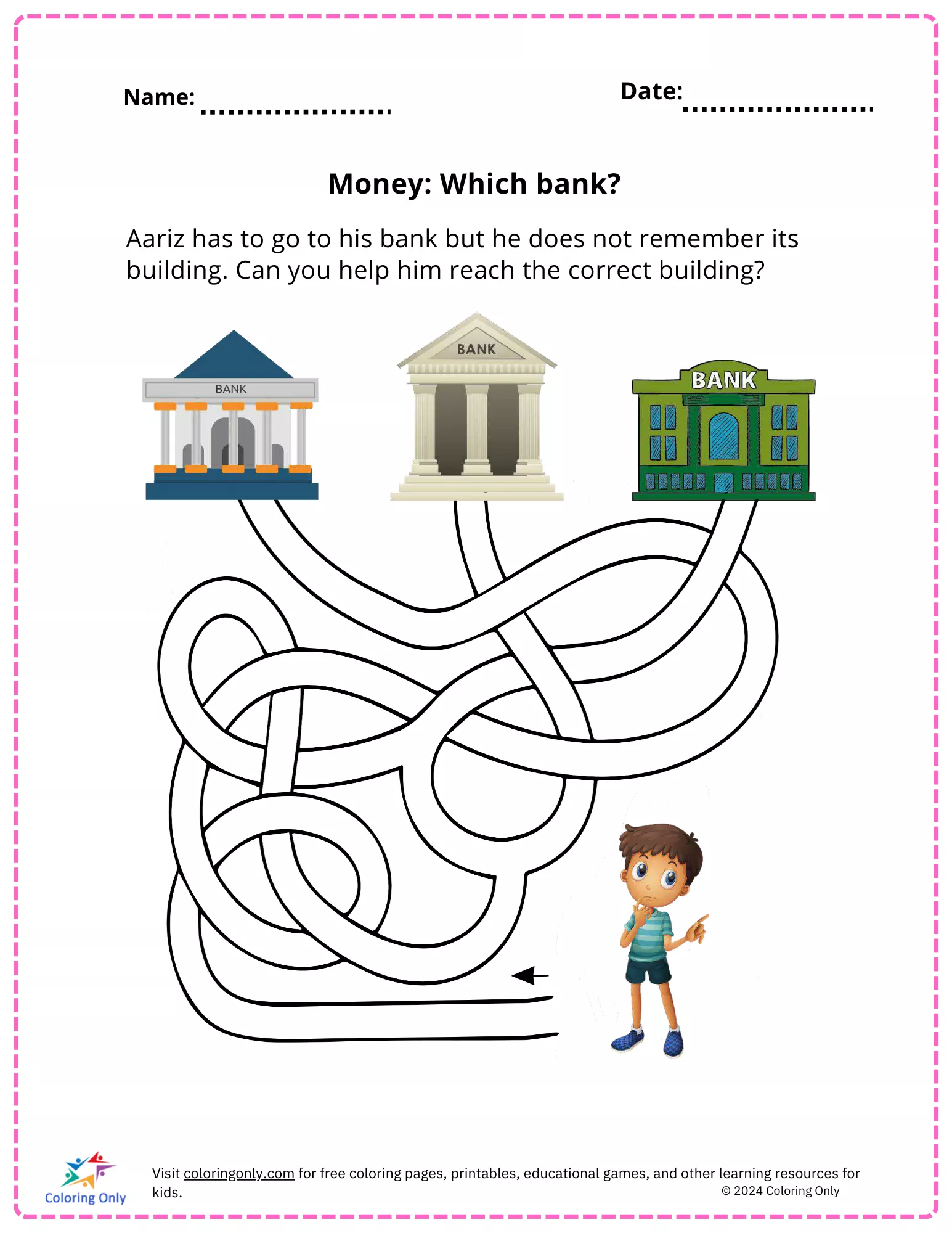 The "Money: Which bank? Free Printable Worksheet" is an engaging and educational activity designed for kindergarten children. This worksheet challenges kids to help Aariz find his way to the correct bank building. By following the maze, children can improve their problem-solving skills and hand-eye coordination. The colorful bank images make the activity visually appealing and fun, encouraging young learners to think critically about money and its association with banks. This "Money: Which bank? Free Printable Worksheet" is a great tool for introducing the concept of money management in an interactive and enjoyable way.