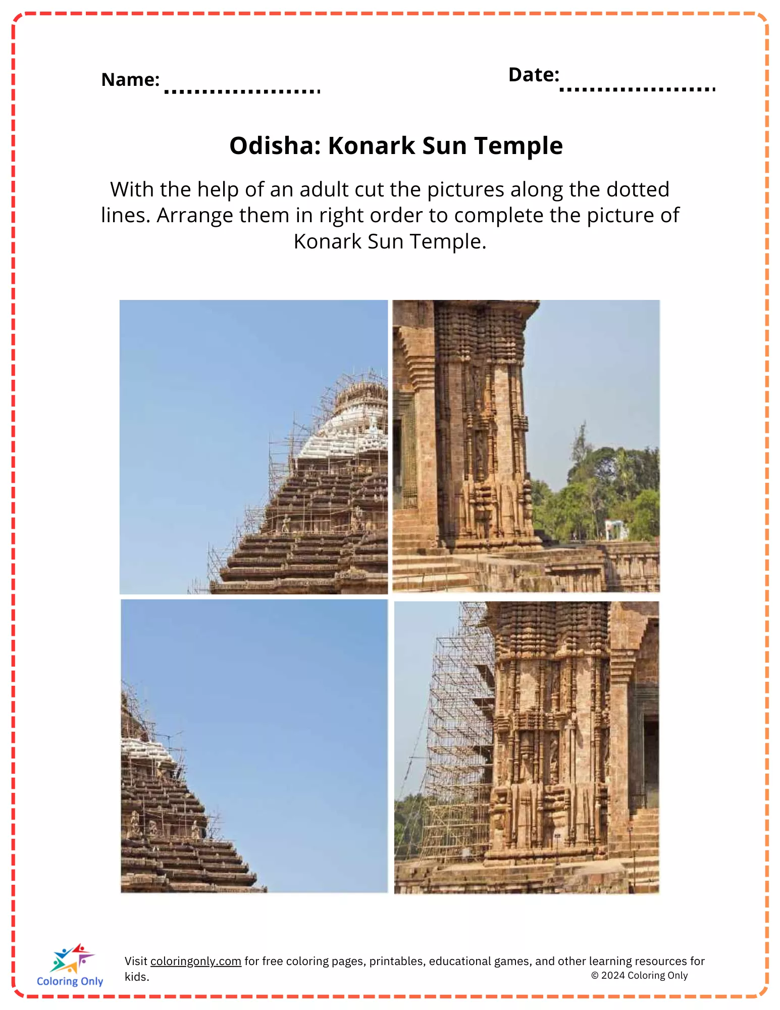 The "Odisha: Konark Sun Temple Free Printable Worksheet" is an interactive activity designed for kindergarten students to explore the iconic Konark Sun Temple. This worksheet features a puzzle where children, with the help of an adult, can cut out the pieces and arrange them in the correct order to complete the picture of the temple. This activity not only introduces young learners to an important cultural heritage site but also enhances their fine motor skills and problem-solving abilities. The "Odisha: Konark Sun Temple Free Printable Worksheet" is a fun and educational way to engage children with India's rich history and architecture.