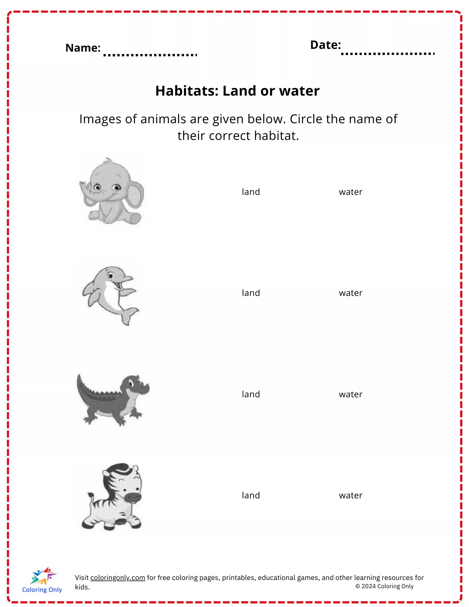 The "Habitats: Land or Water Free Printable Worksheet" is an excellent resource for kindergarten students to explore animal habitats. Through engaging images of animals, children are asked to circle the correct habitat for each—either land or water. This interactive exercise enhances their understanding of different environments while also building recognition skills for animals and where they live. Perfect for early science learning, this "Habitats: Land or Water Free Printable Worksheet" encourages hands-on participation and helps solidify knowledge about the natural world.
