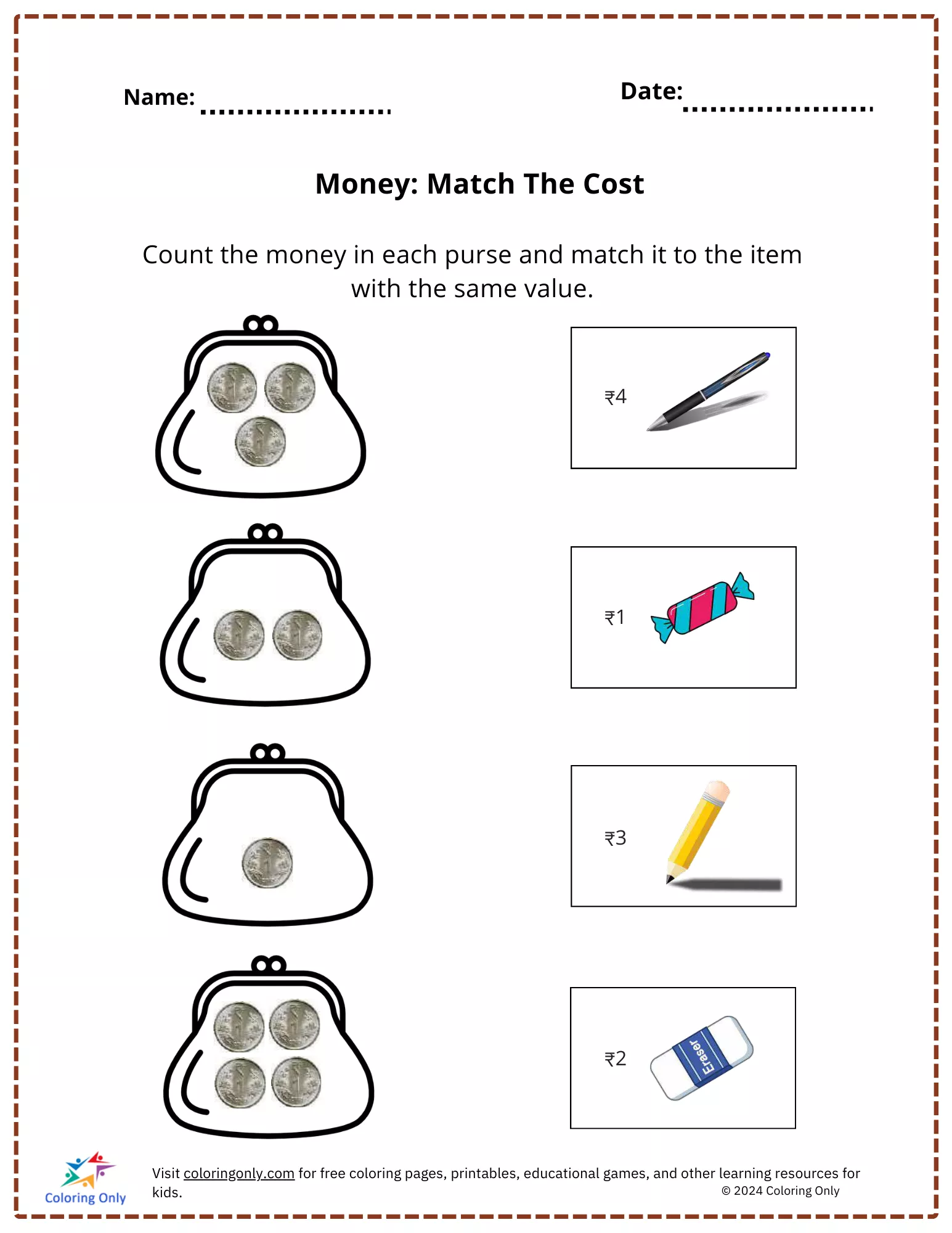 The "Money: Match The Cost Free Printable Worksheet" is an engaging and educational activity designed for kindergarten students to help them understand the concept of money and value. In this worksheet, children will count the coins displayed in each purse and match them to the correct item based on its price. The "Money: Match The Cost Free Printable Worksheet" not only reinforces basic counting skills but also introduces young learners to the concept of money management in a fun and interactive way. This worksheet is perfect for classroom activities, homeschooling, or additional practice at home, making learning about money an enjoyable experience.