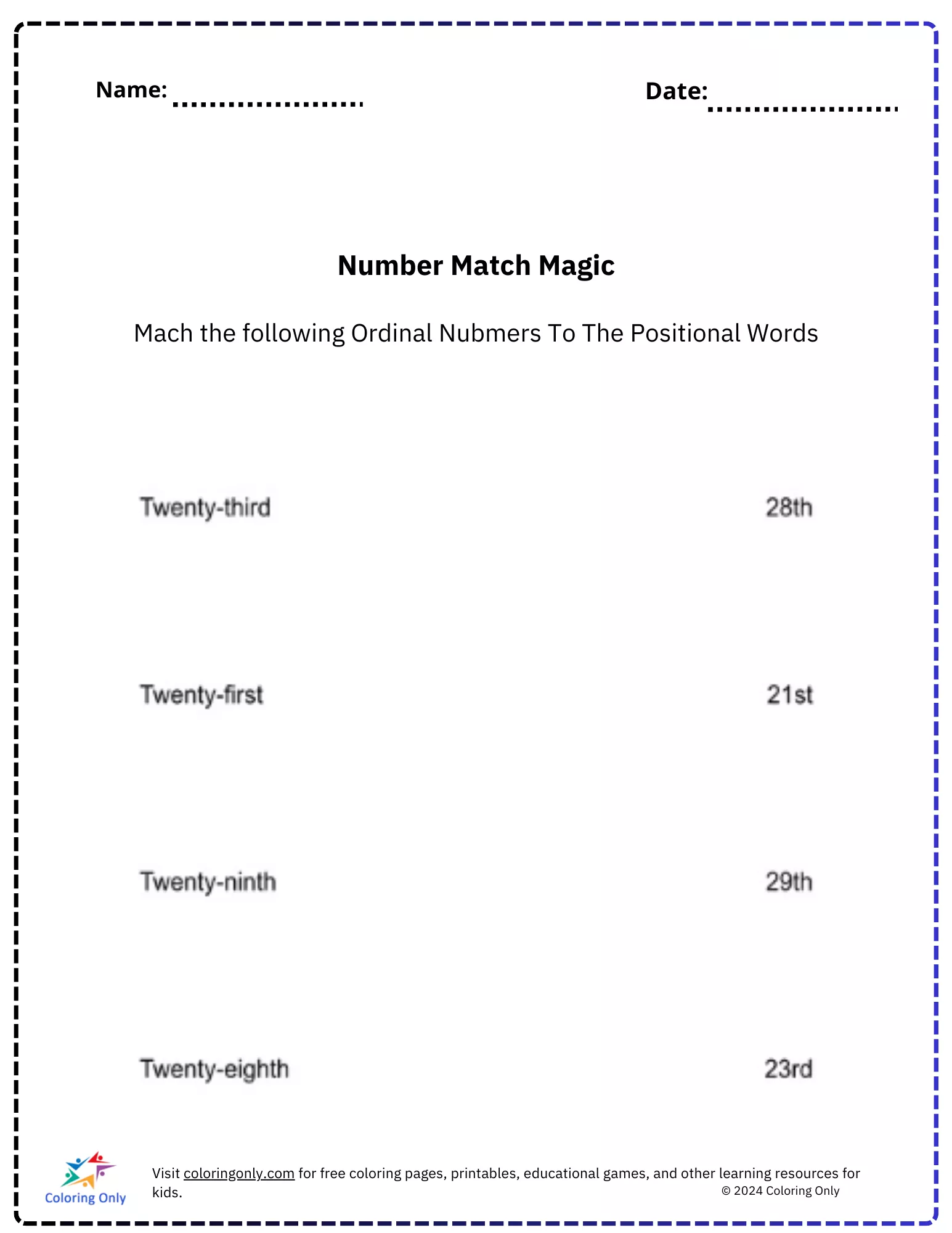 The Number Match Magic Words Free Printable Worksheet is a delightful educational resource designed for kindergarten students to enhance their number recognition skills. In this interactive worksheet, children will match numbers with their corresponding words, such as "one," "two," and "three." This engaging activity not only promotes literacy but also reinforces numerical understanding in a playful way. The Number Match Magic Words Free Printable Worksheet is perfect for classroom use or at-home learning, making it a fun addition to any early education curriculum. By completing this worksheet, children will gain confidence in their counting and word recognition abilities while enjoying the magical world of numbers.