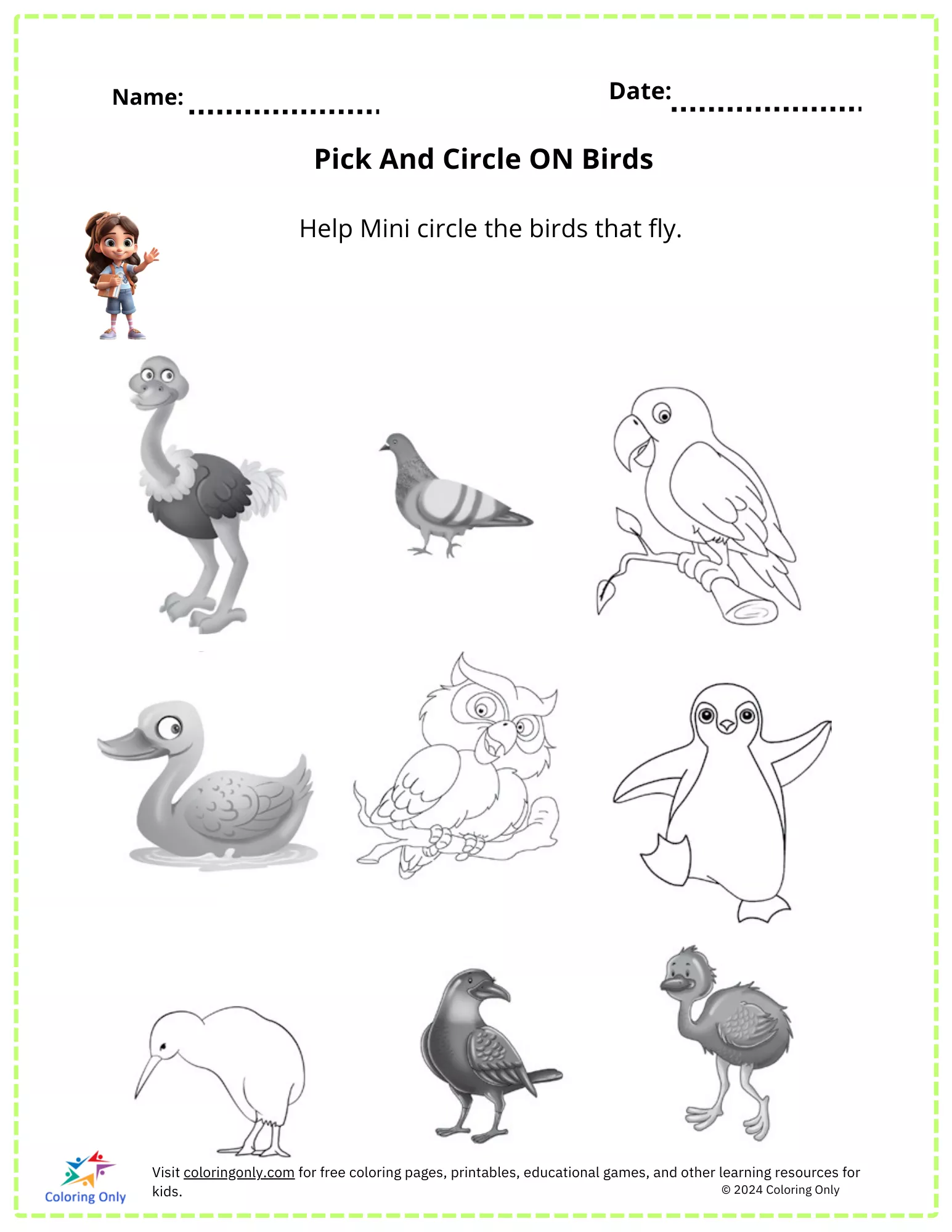 Enhance your child's observation and categorization skills with our "Pick And Circle ON Birds Free Printable Worksheet"! Perfect for kindergarteners, this engaging worksheet encourages children to identify and circle birds that can fly. The "Pick And Circle ON Birds Free Printable Worksheet" features a variety of bird illustrations, some that fly and some that don't, challenging kids to make the correct choices. This activity enhances visual discrimination, cognitive abilities, and attention to detail while making learning fun. Ideal for both classroom activities and at-home practice, the "Pick And Circle ON Birds Free Printable Worksheet" provides an enjoyable way to reinforce essential skills. Download your copy today and watch your child's knowledge of birds soar